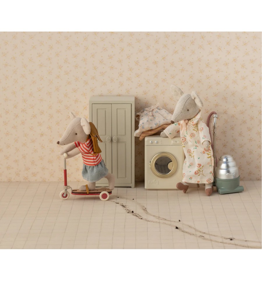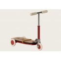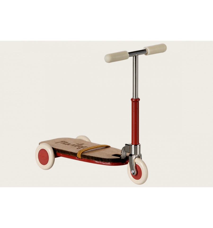 Una patineta con detalles de madera. Tiene metal en el manillar para que los ratones con imanes en las manos se puedan sostener, además de un elástico en la tabla para asegurar que lo pies queden fijos sobre la misma.