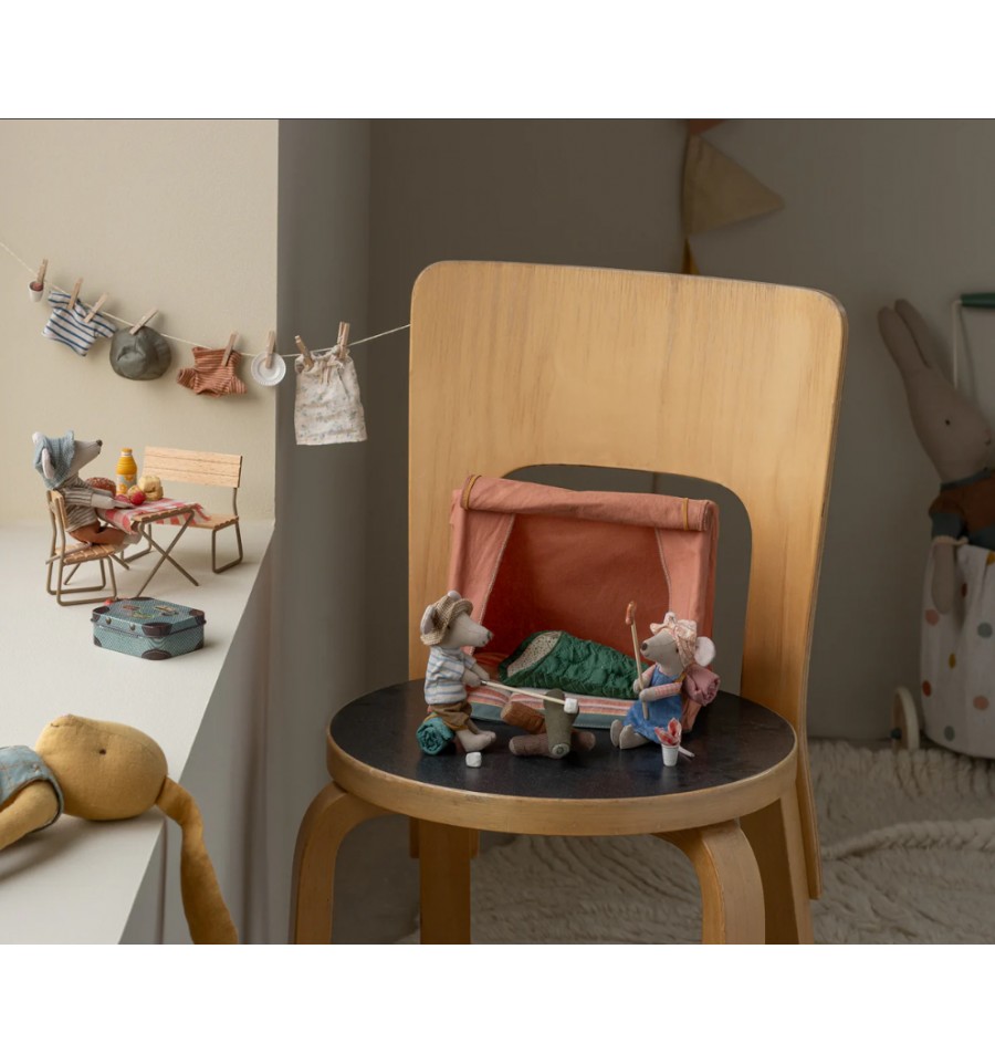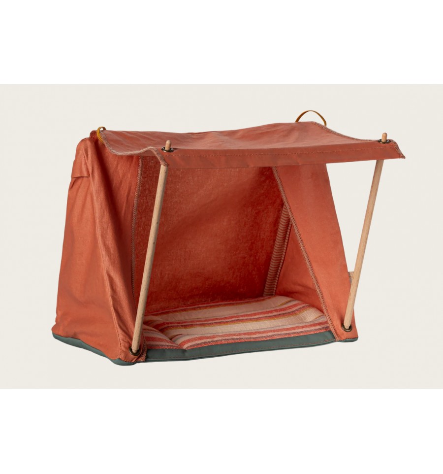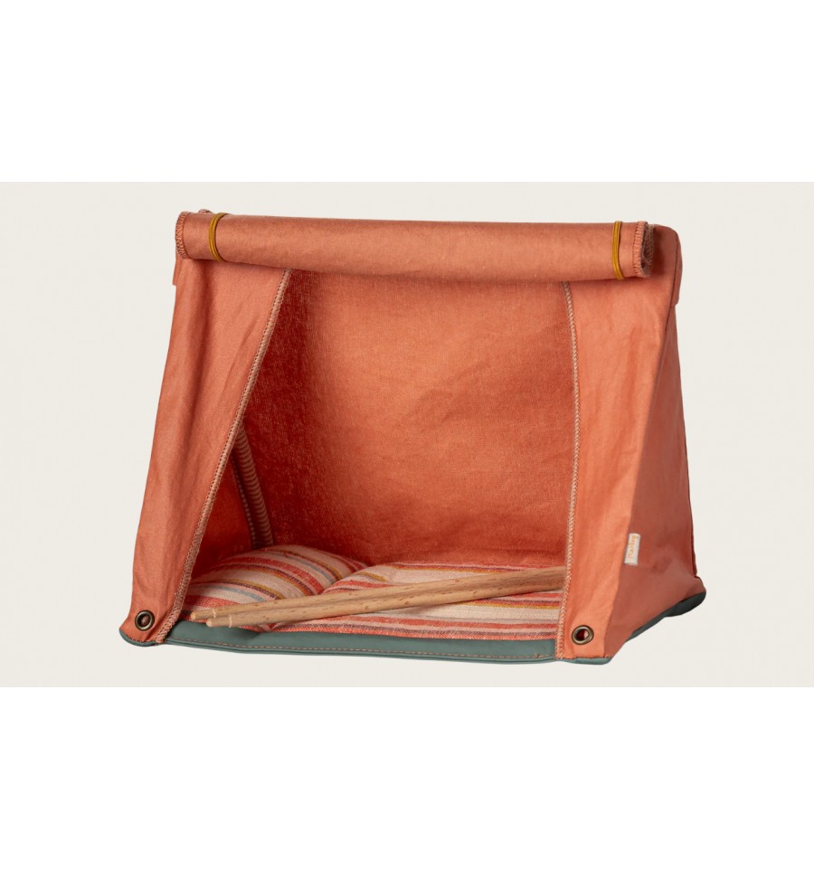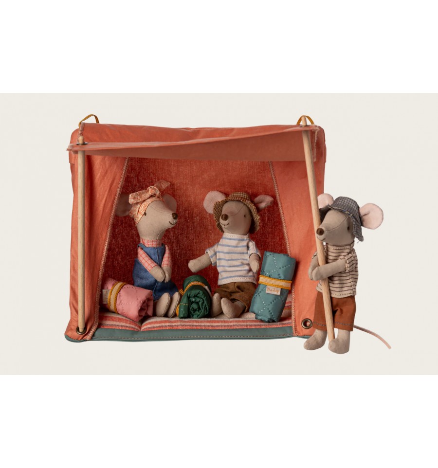Lleva a tus ratones a dormir en la tienda plegable. Los palos sujetan la puerta y la protegen de la lluvia. La tela exterior tiene una superficie recubierta para un toque más auténtico. Acuérdate de pedirles que traigan sus sacos de dormir.