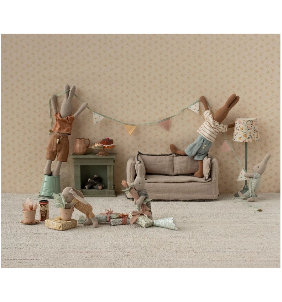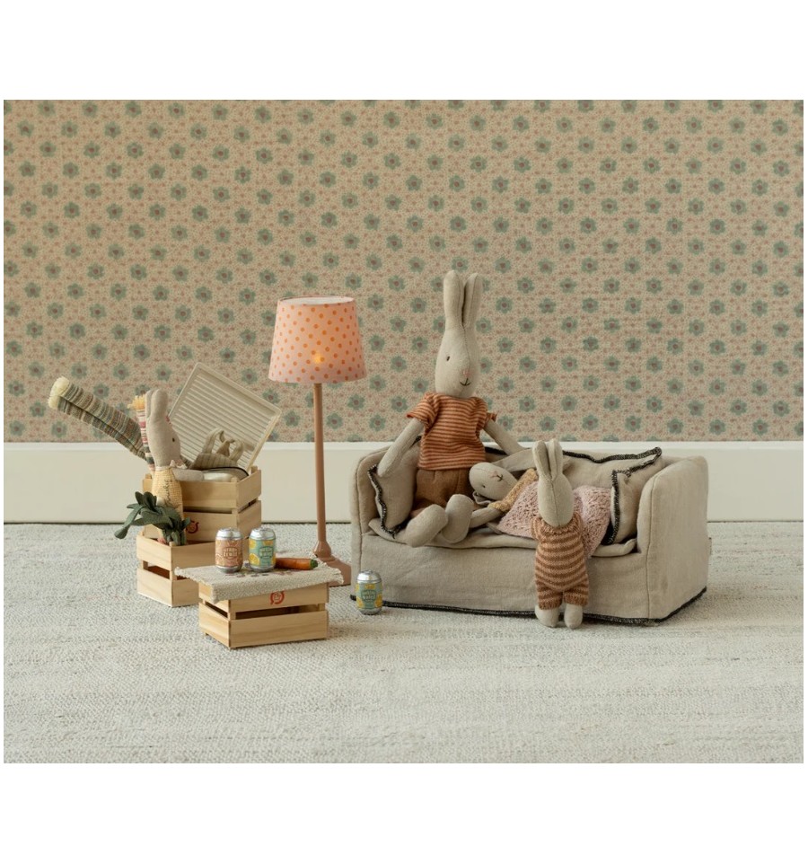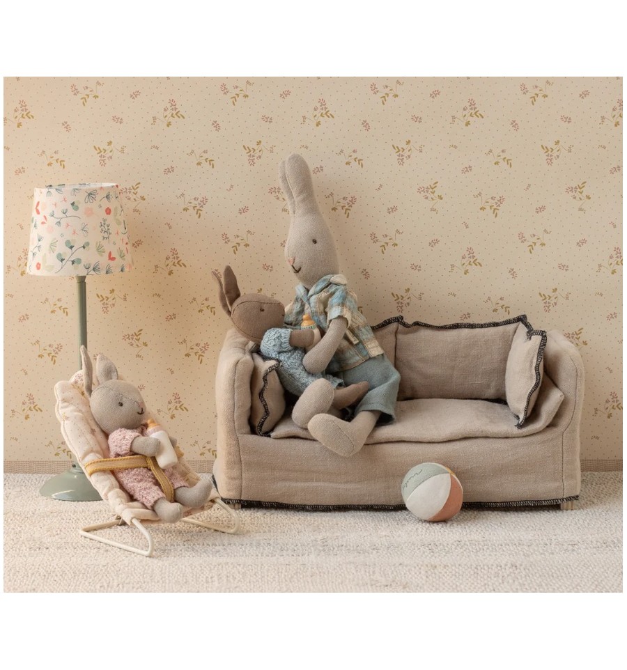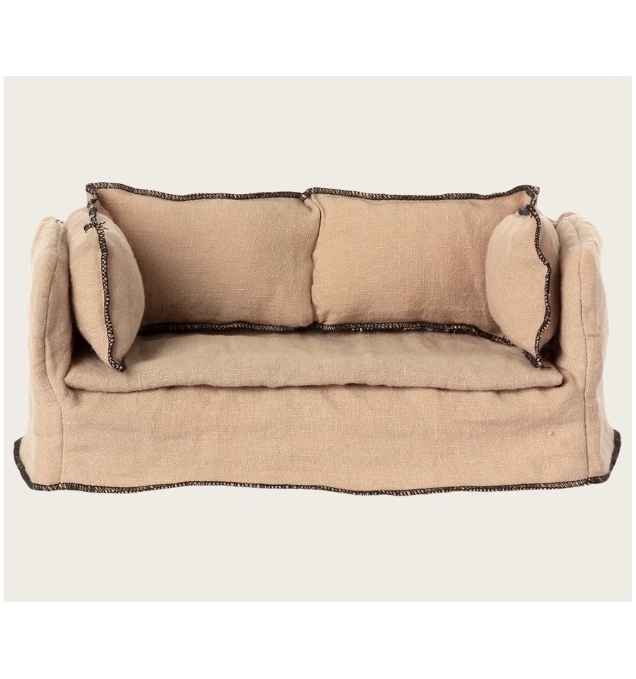 Descansa en este encantador sofá. Tiene un centro de madera y una suave funda de lino de excelente calidad. Combínalo con la mesa de centro y quedará perfecto en la casa de muñecas Maileg.