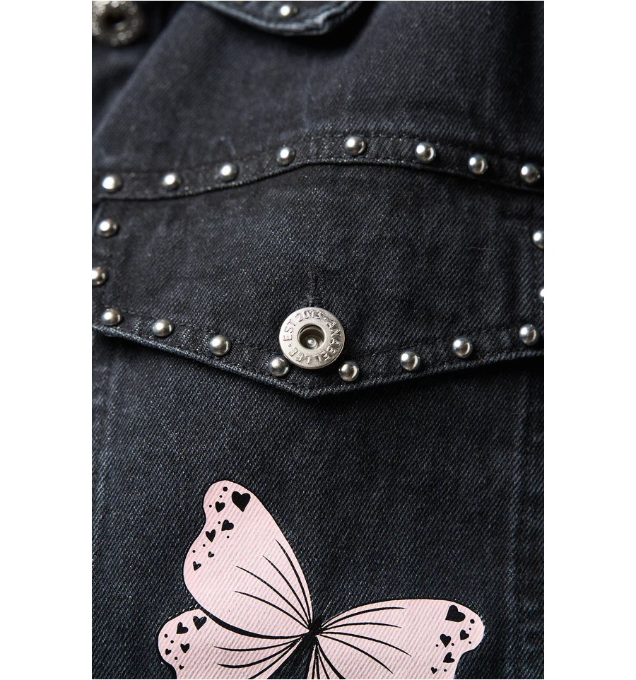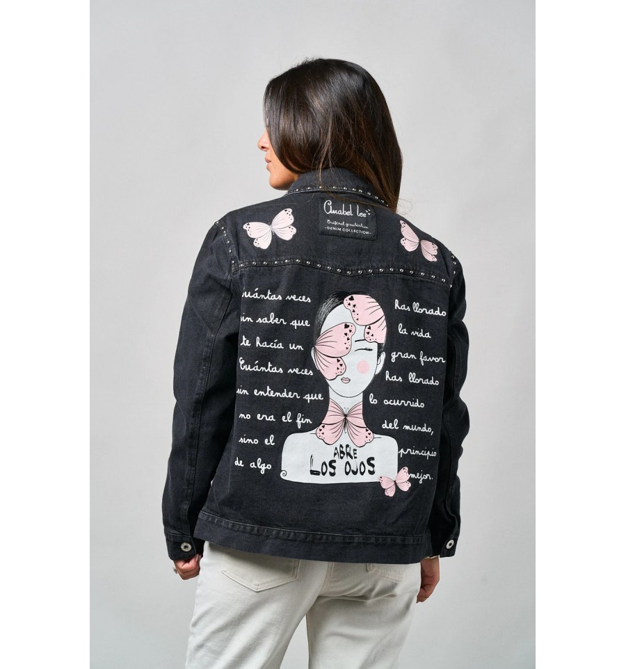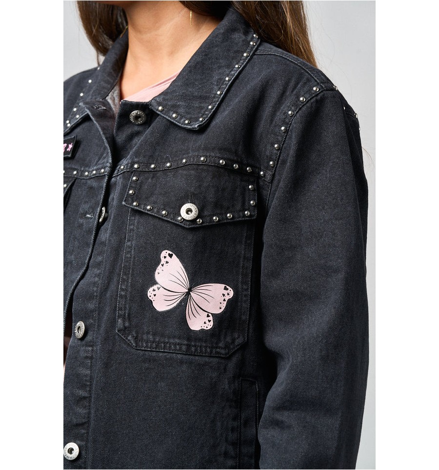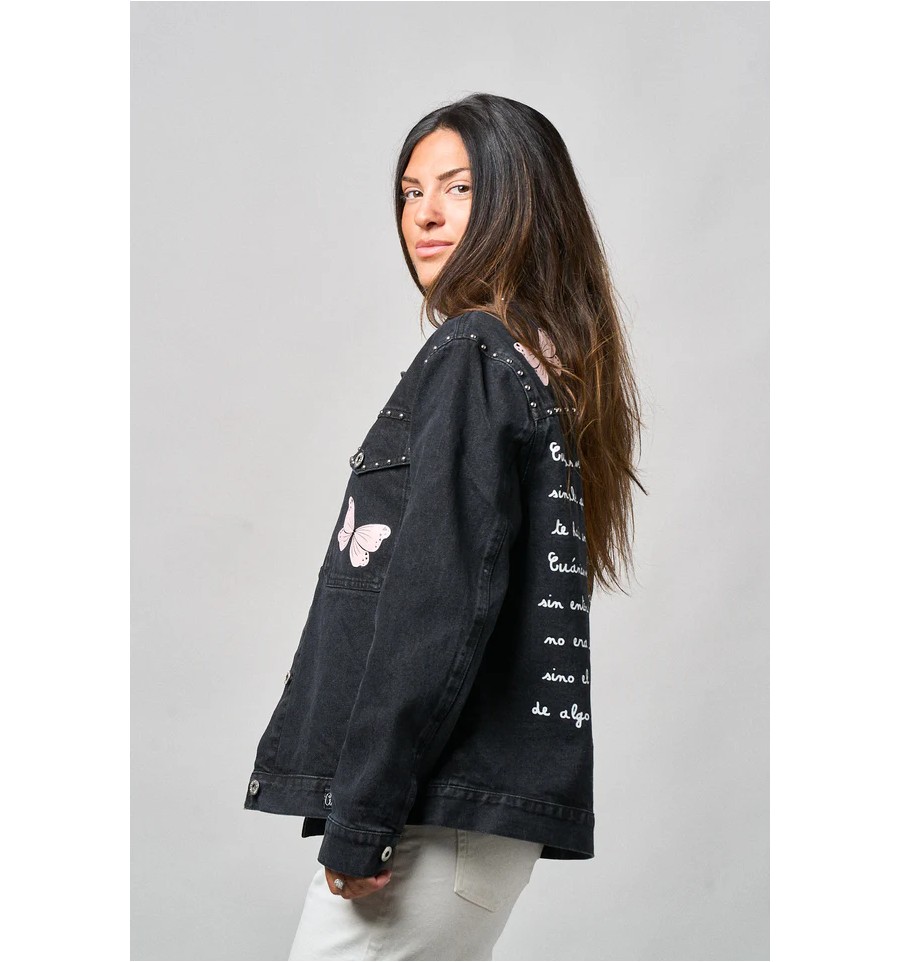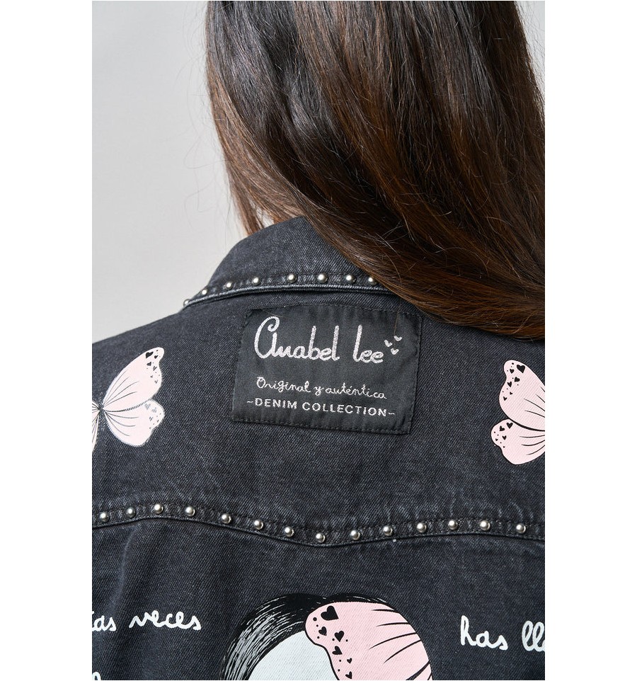 -Detalle de tachuelas metálicas en cuello, canesú, hombros y bolsillos.