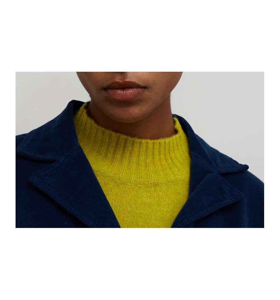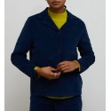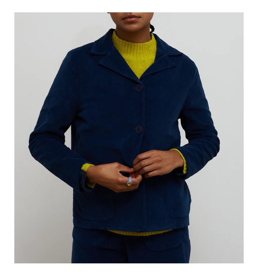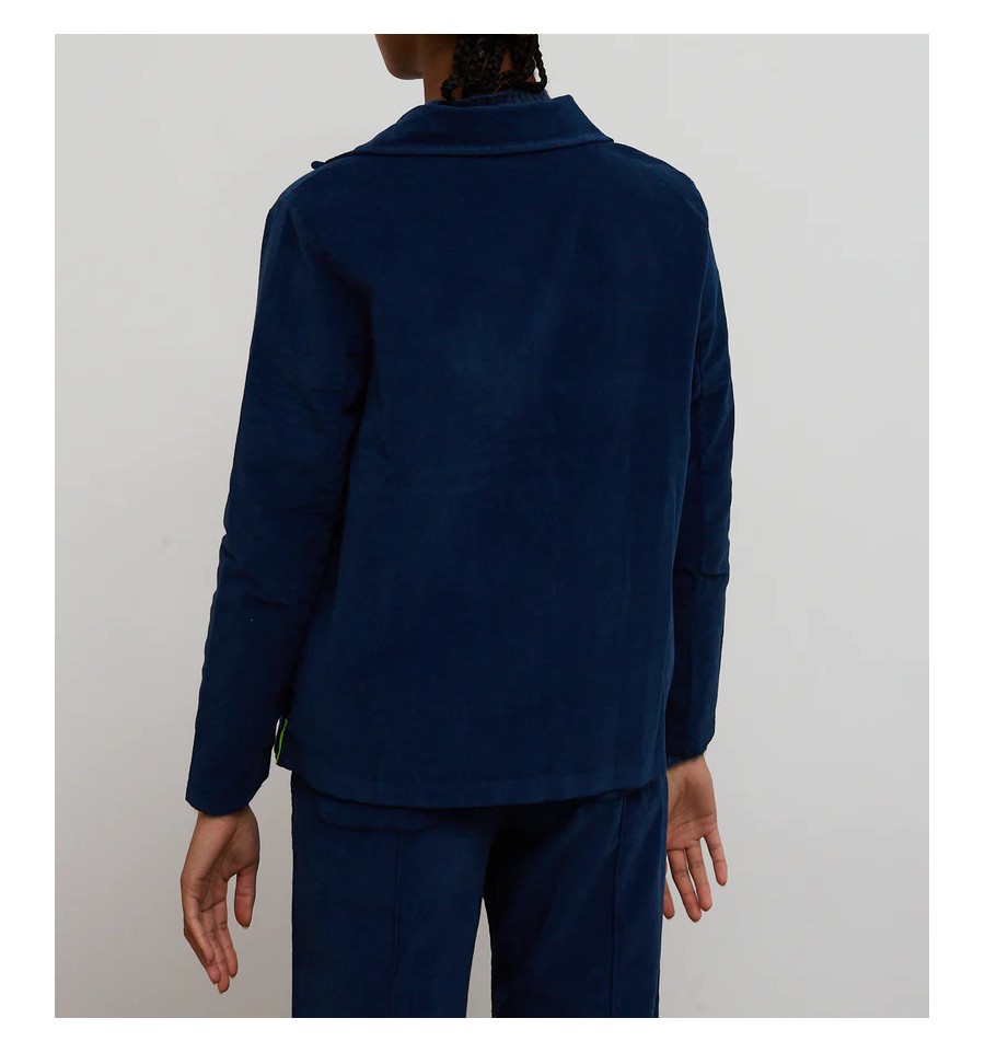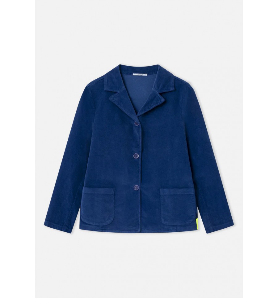 Chaqueta americana en tejido terciopelo color azul. Corte recto y mangas largas. Cuello con solapa clásica. Botonadura para cierre frontal. Bolsillos frontales cuadrados. Detalle de etiqueta color neón en el lateral.