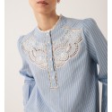 Esta camisa de popelín será la más especial de tu armario. De cuello caja y cierre abotonado de media tapeta, con motivos florales recortados a mano. El tejido de popelín a rayas con ese toque romántico, la convierten en una prenda diferente.