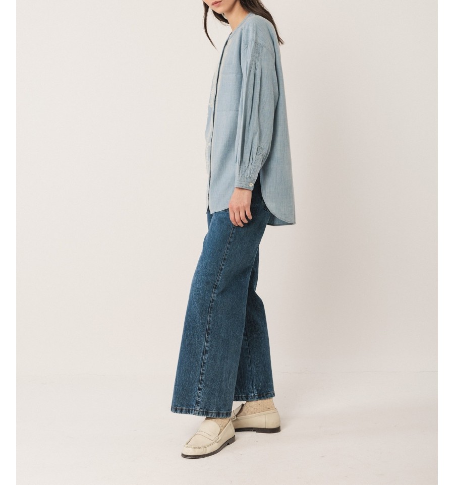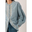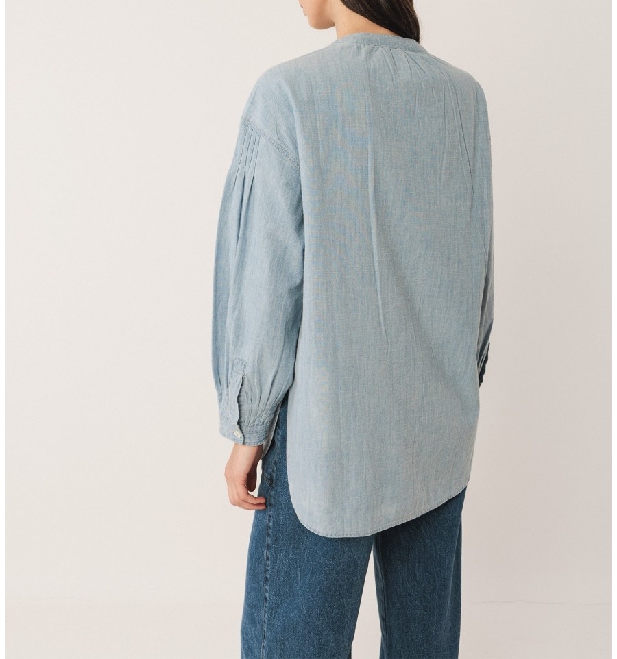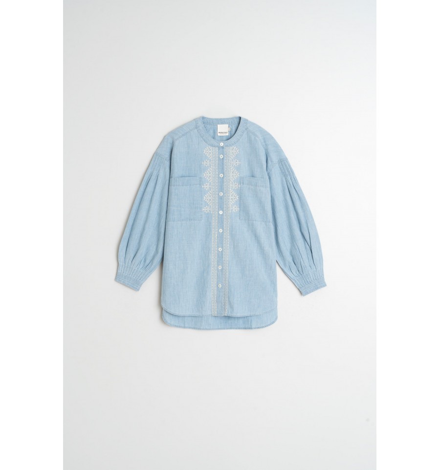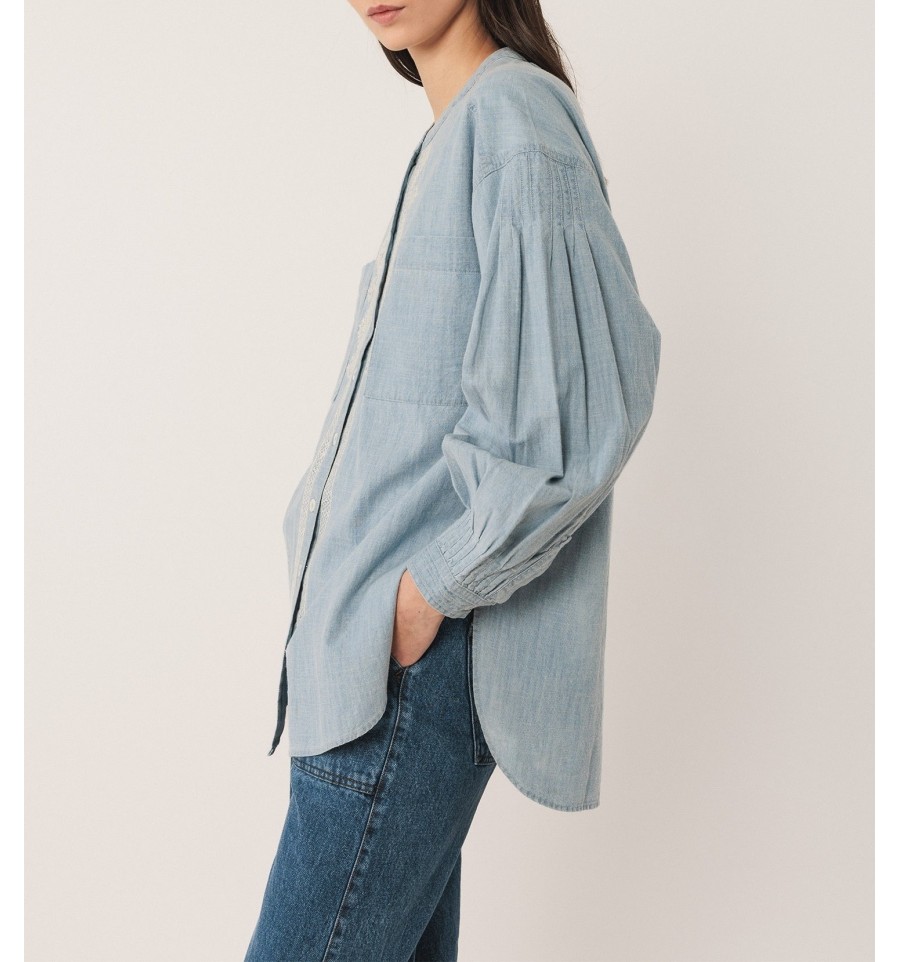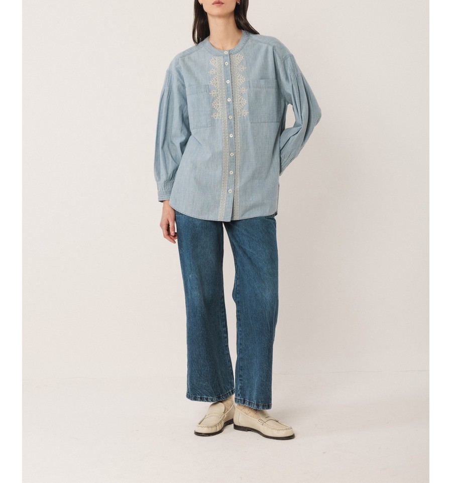 Esta camisa denim de cuello redondo es una de nuestras prendas favoritas. Tiene maxi bolsillos de parche frontales y un bordado étnico en la tapeta. Los detalles de pliegues en las mangas y los hombros aportan el volumen perfecto.