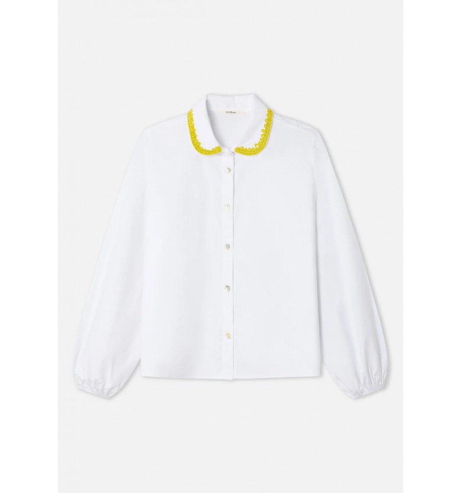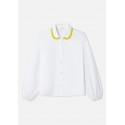 Camisa blanca de manga larga con cuello camisero decorado con bordado en contraste amarillo neón. Corte recto, cierre de botones delanteros y puños elásticos.