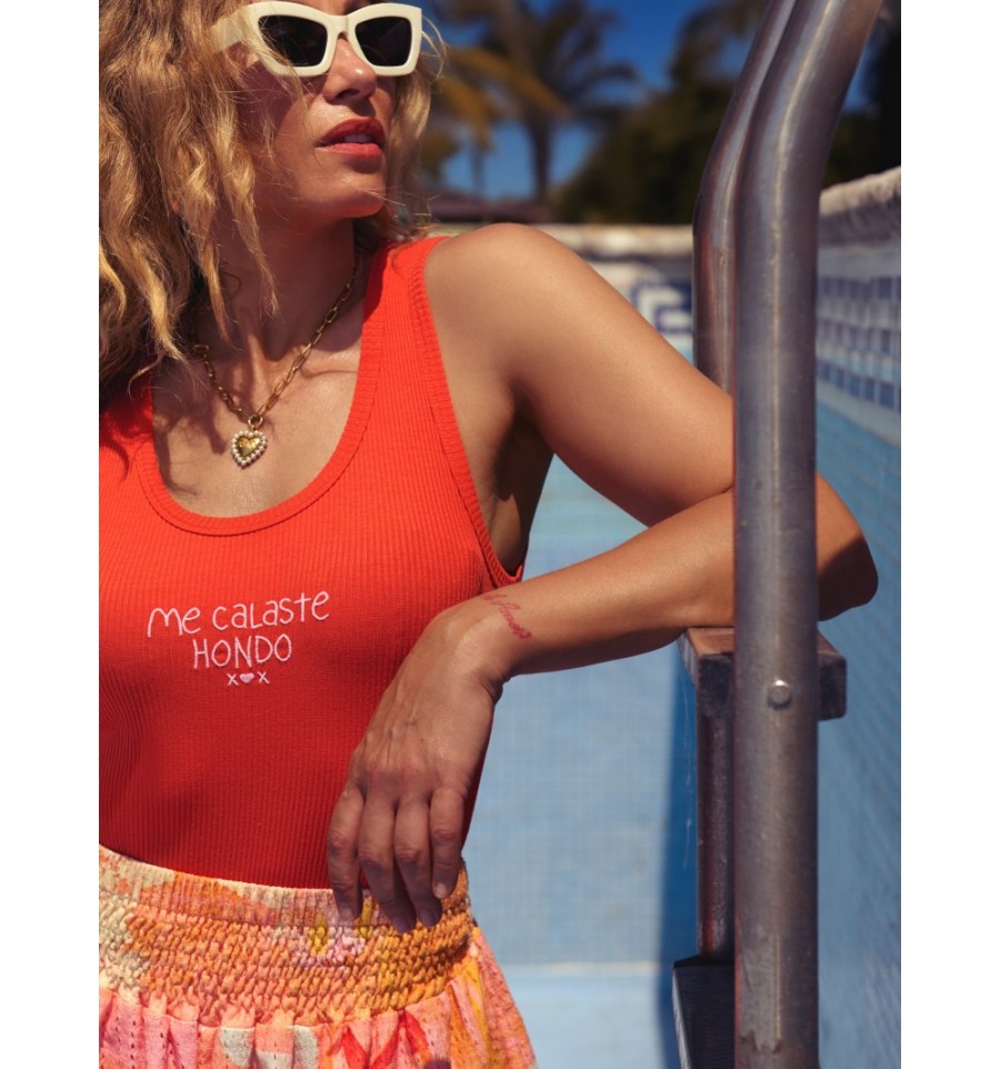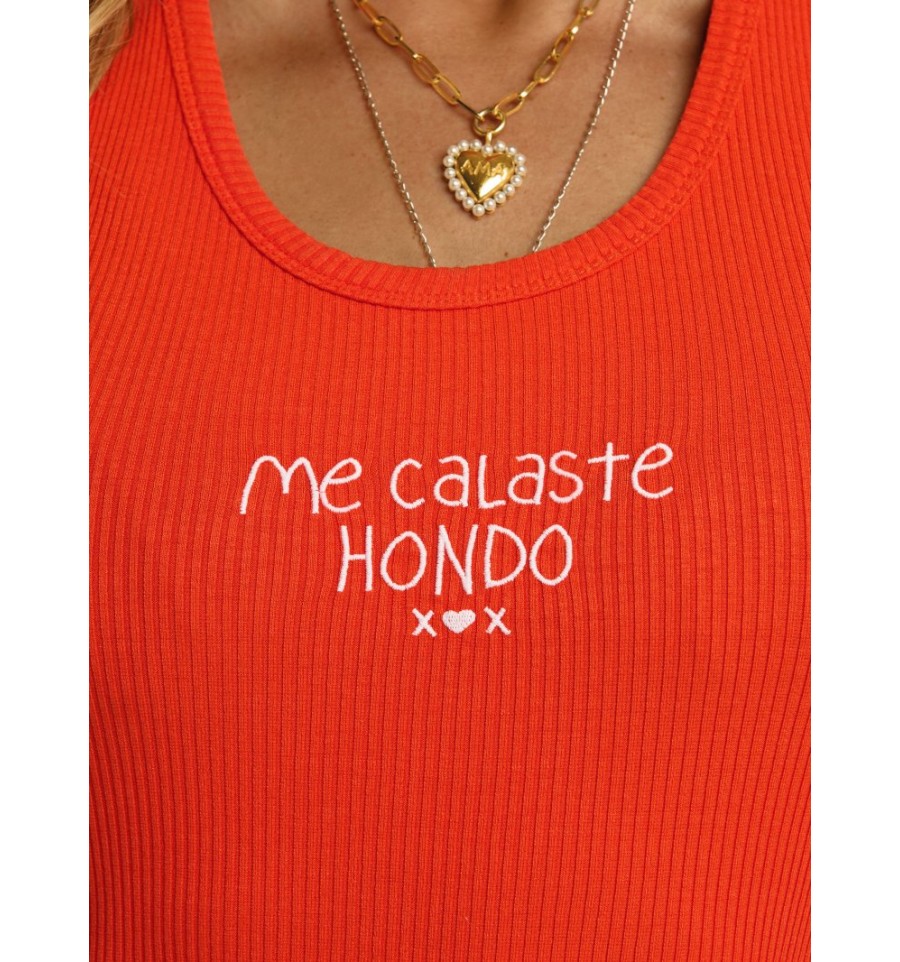 Camiseta entalladita de canalé con bordado central "Me Calaste Hondo" color rojo anaranjado