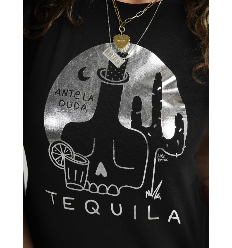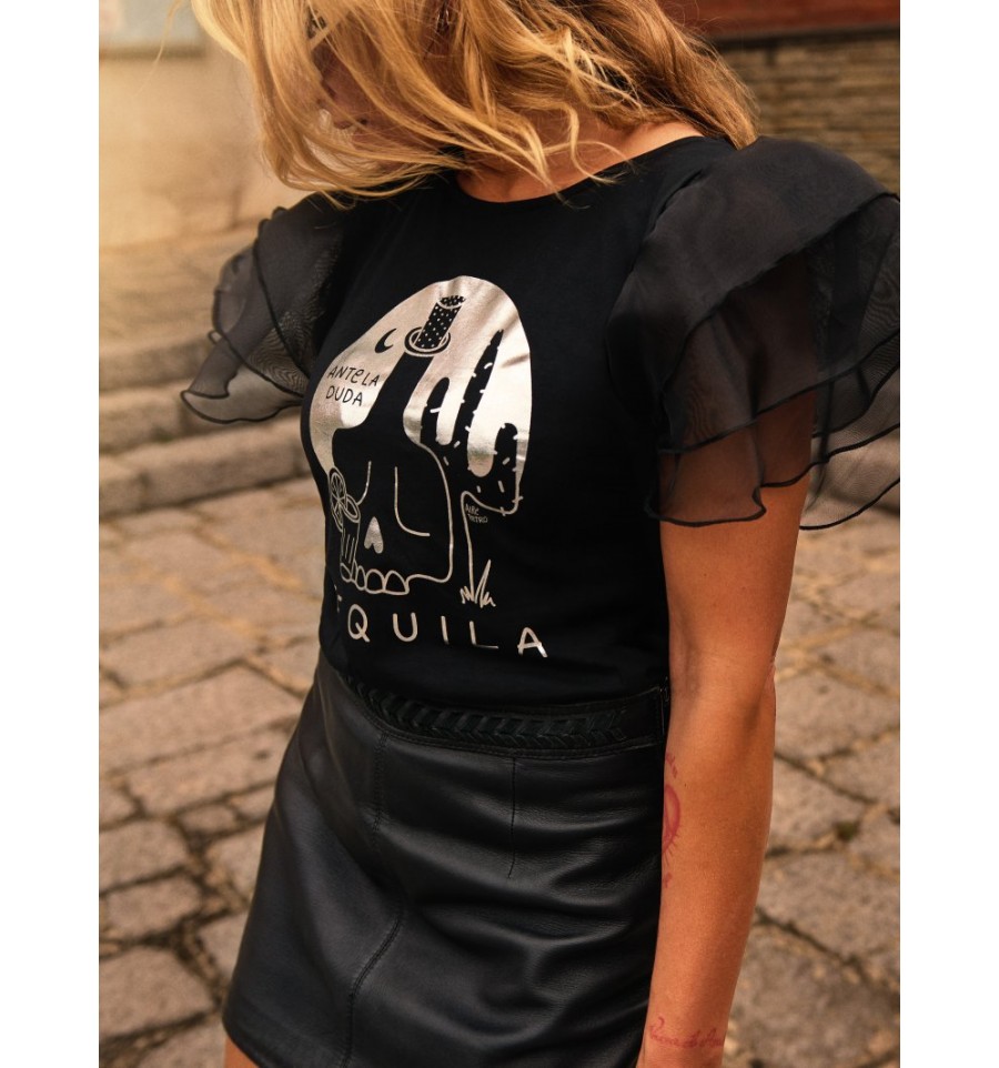 Camiseta negra con estampado foil plata y mangas de organza con volumen extra, que le dará a tu look el toque más chic!