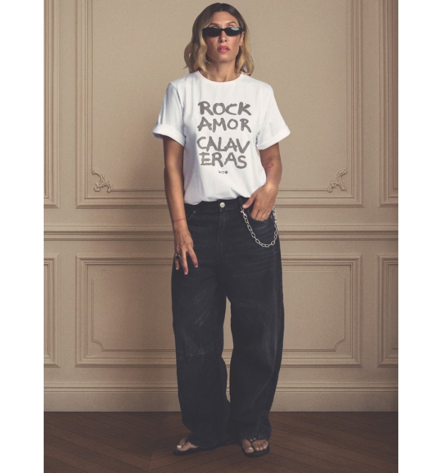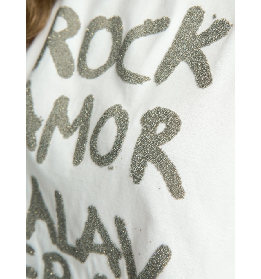 Camiseta básica de algodón relaxed fit con estampado e incrustaciones de bolitas tipo caviar en plata.