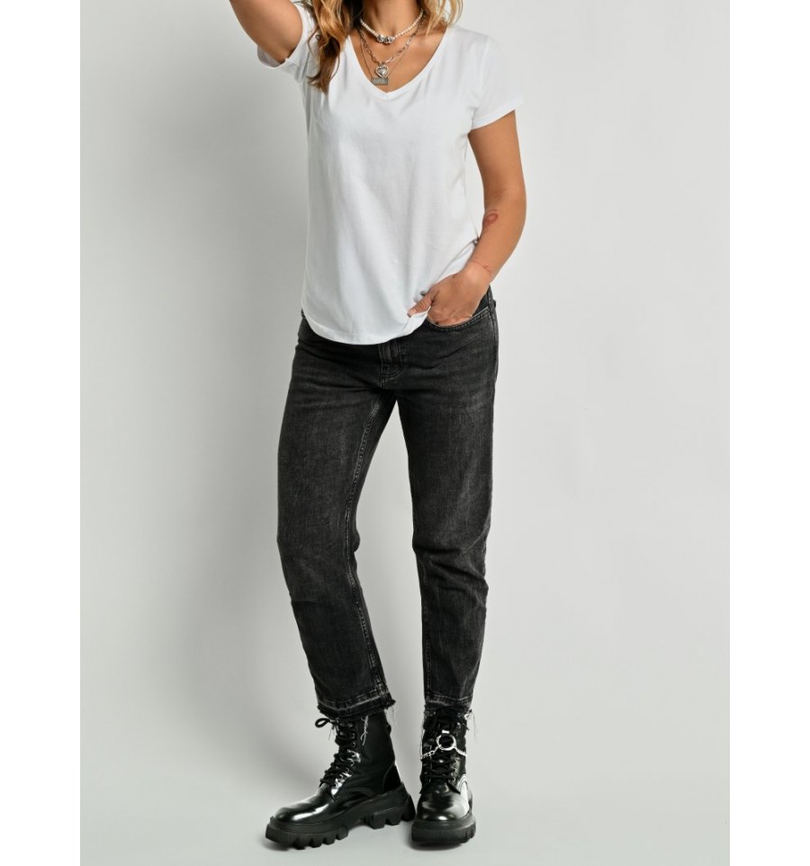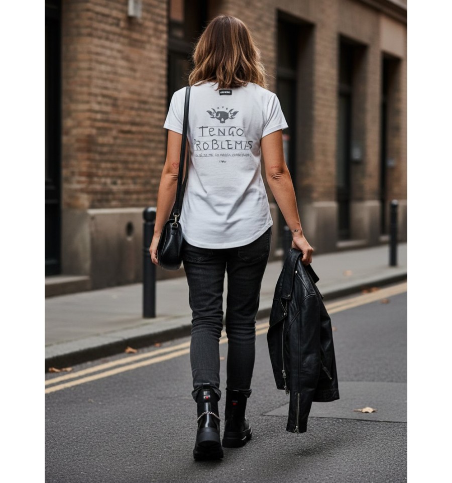 Camiseta blanca de cuello pico con frase en la parte trasera "TENGO PROBLEMAS (No sé si te lo había comentado)"