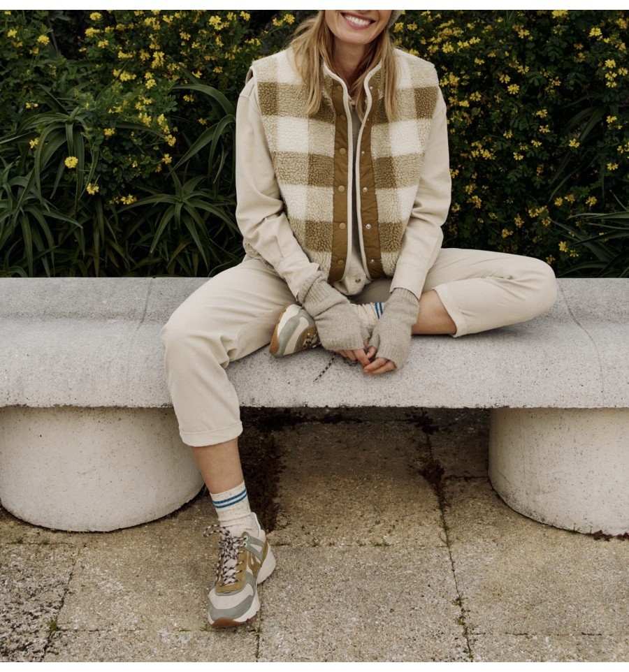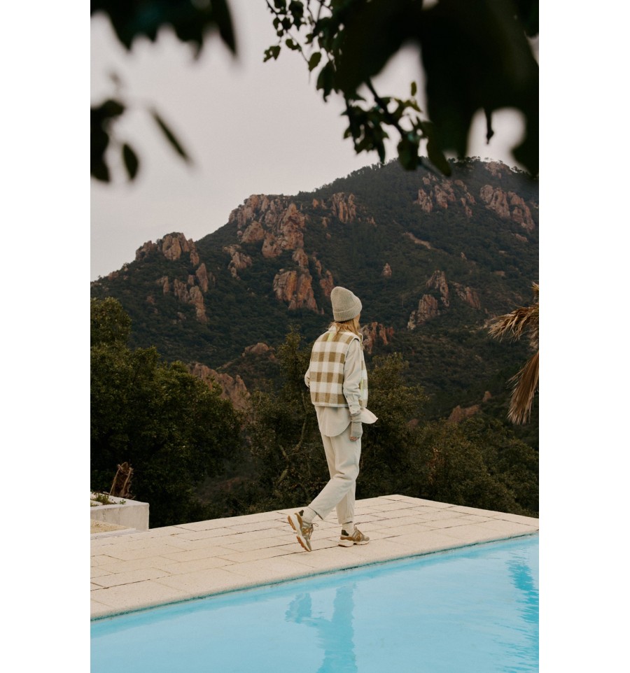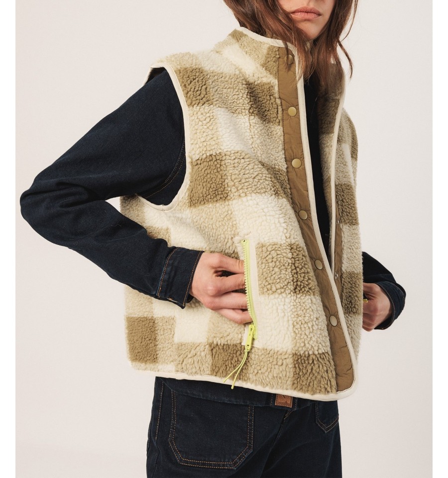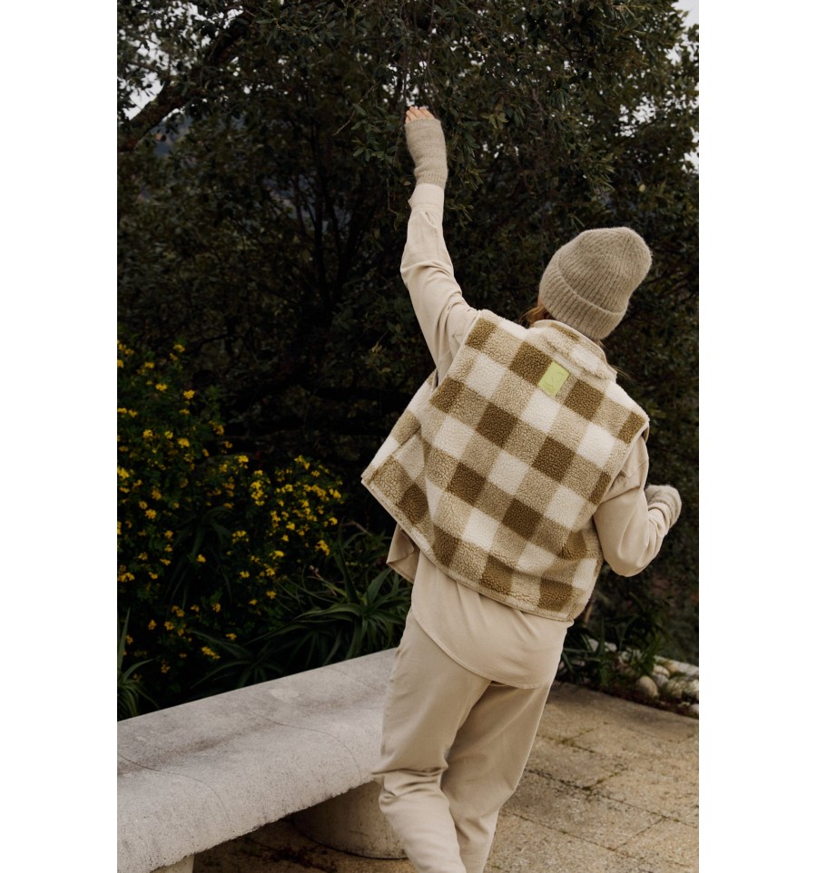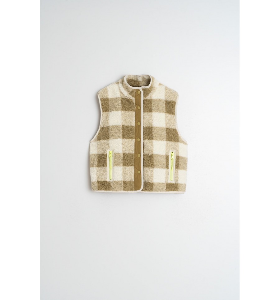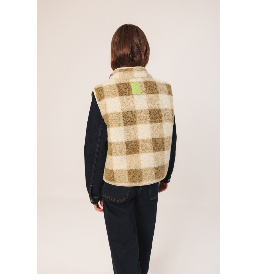 Los chalecos también elevan un look. Este de maxi cuadro vichy con efecto teddy y detalles en contraste son un indispensable en cuanto a prenda exterior.