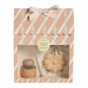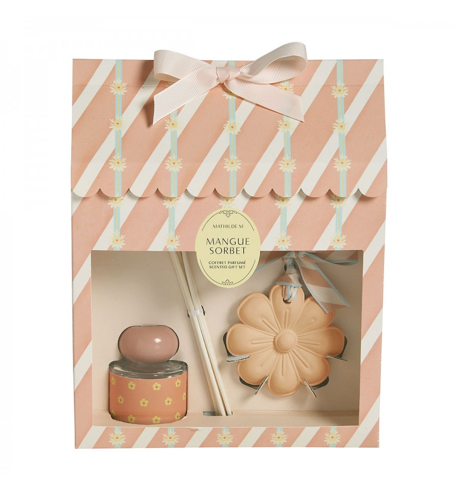 El estudio de creación Mathilde M instala su cuartel de verano bajo el sol a orillas del mar y se inspira poéticamente en las emblemáticas casetas de playa francesas y en la elegancia de las rayas, este elemento gráfico atemporal reinterpretado con suavidad y fantasía en esta colección llena de sol. Una escapada de verano con colores aterciopelados que visten nuevos aromas que huelen a verano: la fragancia soleada del neroli, la dulzura del coco y la delicadeza adictiva del mango.