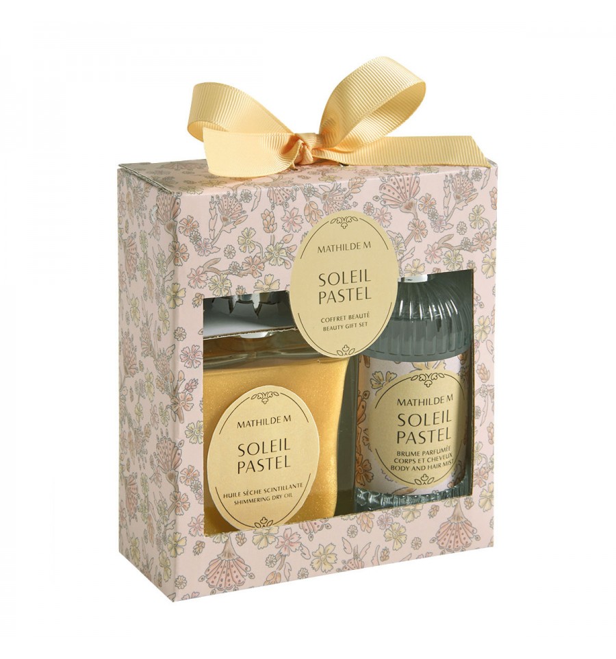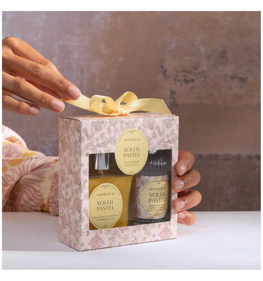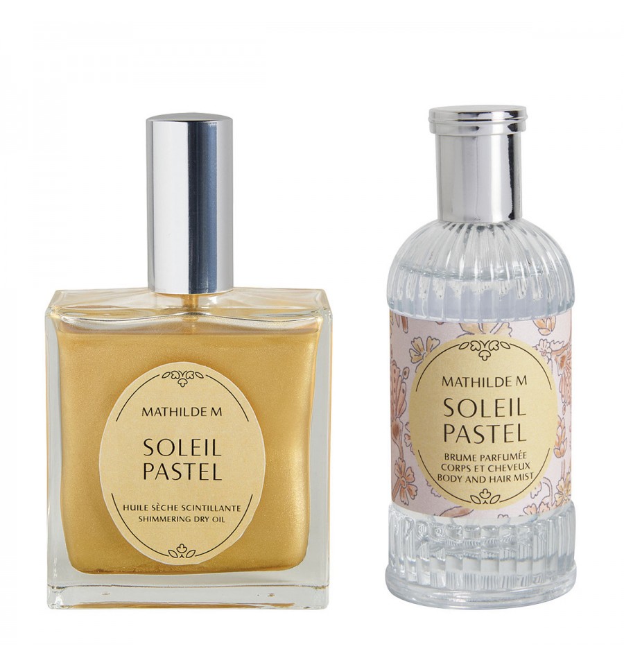 Descubra una idea de regalo refinada con esta adorable caja perfumada que contiene un aceite seco y una bruma para el cuerpo y el cabello. Su fórmula, compuesta por un 95% de ingredientes de origen natural y baja en alcohol, perfuma ligeramente, sin dañar la piel y el cabello expuestos al sol. Completa tu ritual Mathilde M con nuestro aceite seco Shimmering. Enriquecido con preciosos aceites vegetales con propiedades nutritivas, incluidos los de argán y jojoba, deja la piel satinada y luminosa a la vez que la deja suave y sedosa, sin película grasa.