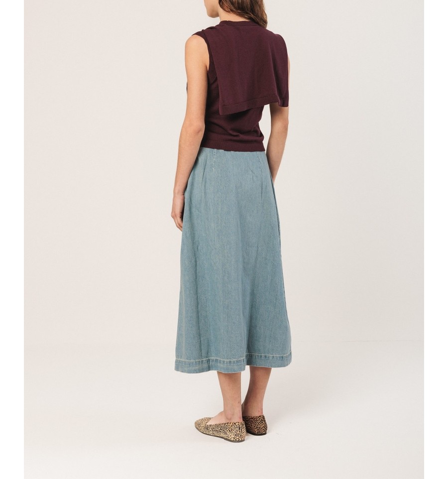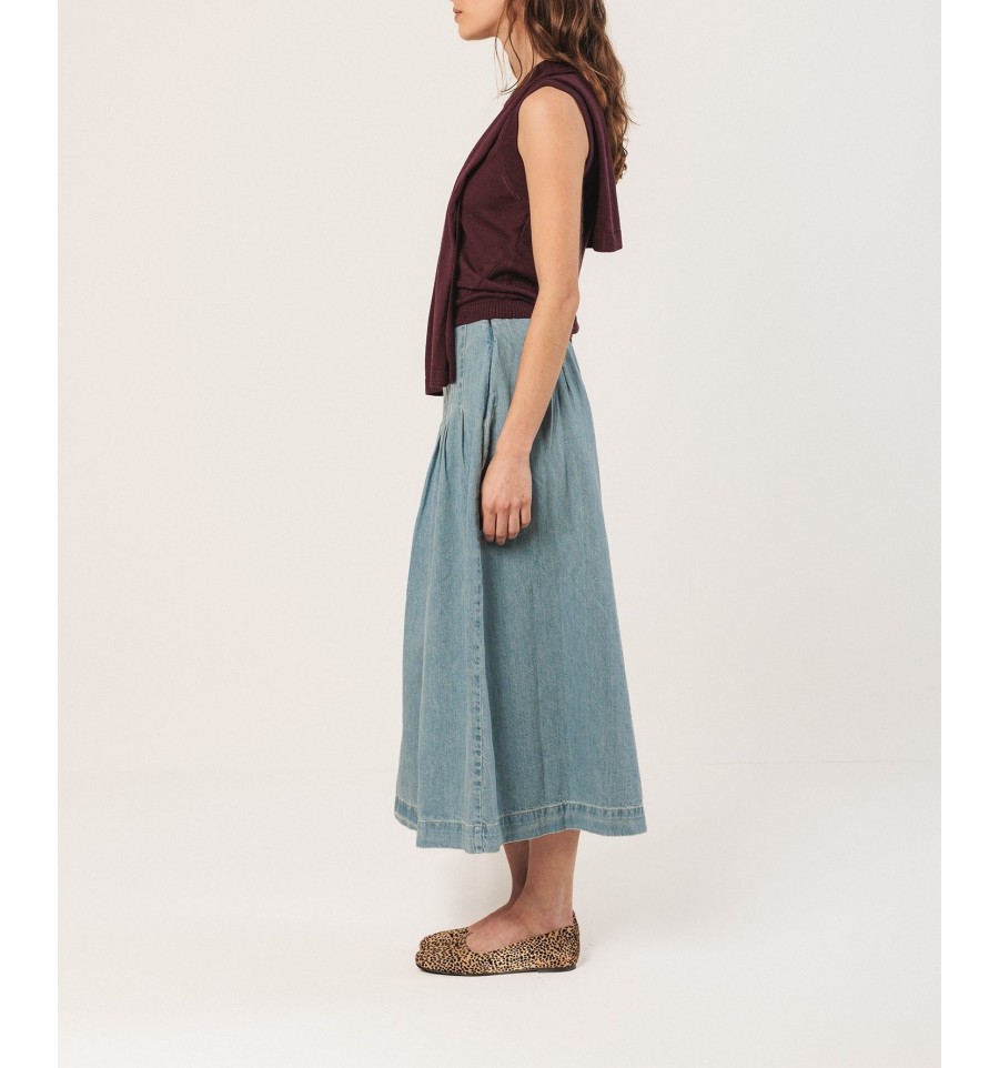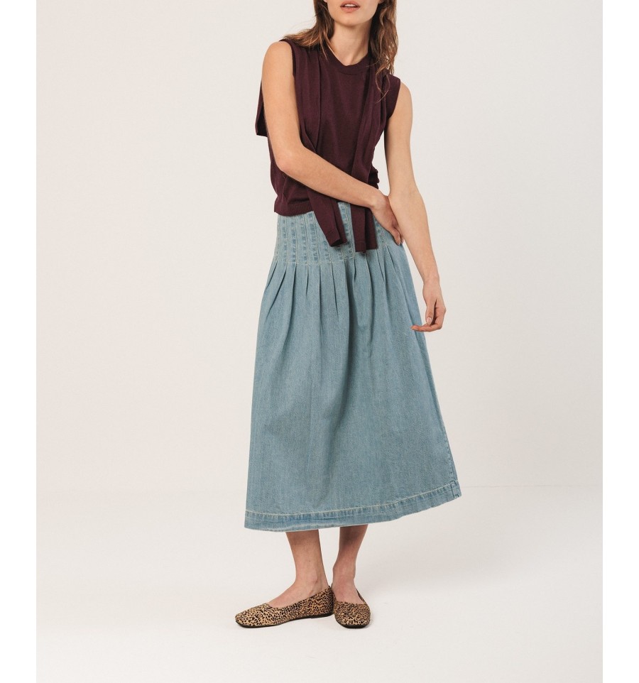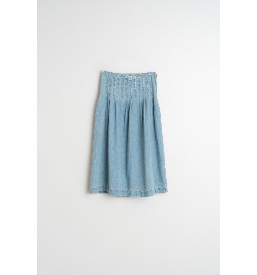 ¿Te gustan las faldas midi ? Esta sin duda es un must de la temporada. Cintura media con pliegues que se ajustan perfectamente al contorno y su tejido denim le da cuerpo a la prenda.