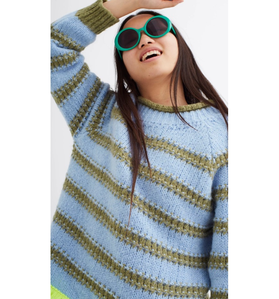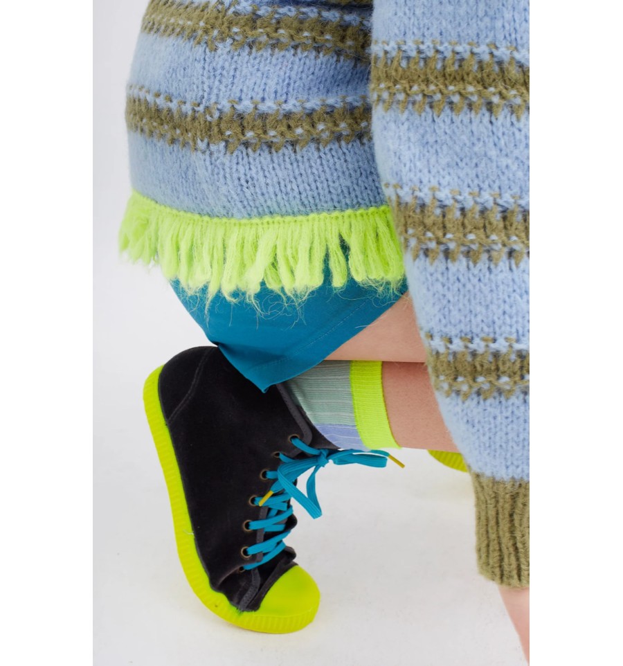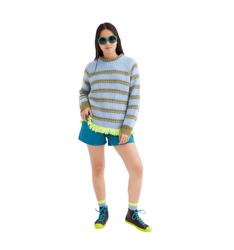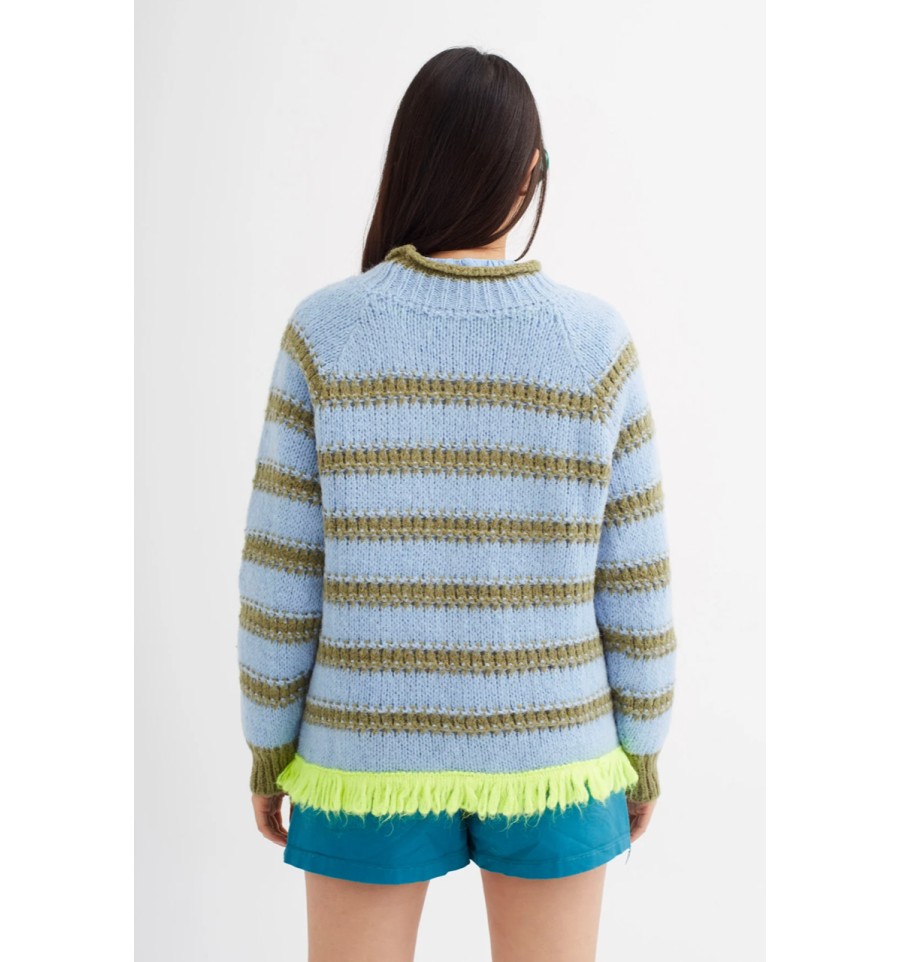 Jersey a rayas color azul y verde caqui con flecos a contraste.
