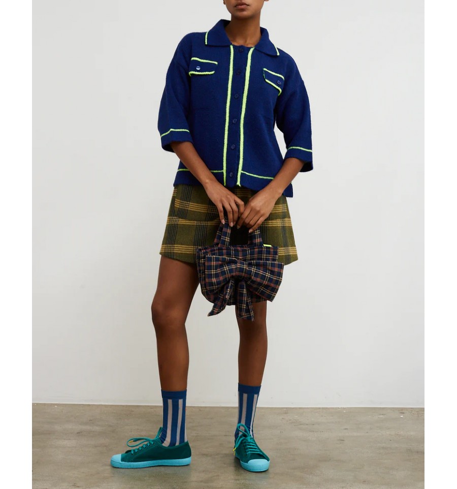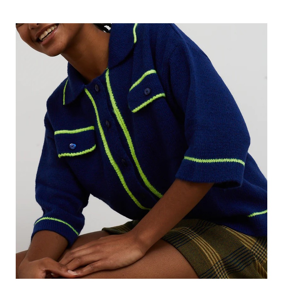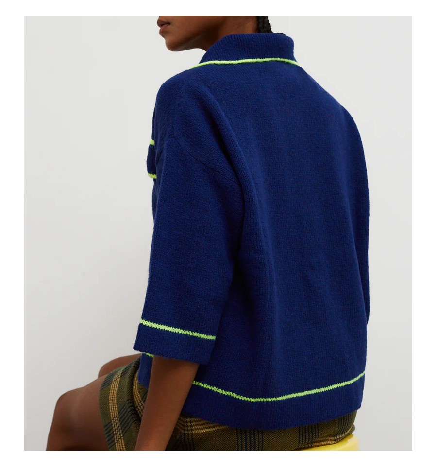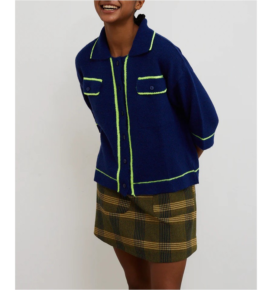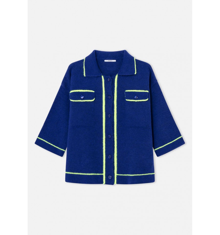 Cárdigan bicolor de manga 3/4 en azul Klein con detalles en amarillo neón. Corte recto, cuello tipo solapa en punto canalé y bolsillos frontales con botones al tono. Confeccionado en una suave mezcla de lana gustosa al tacto.