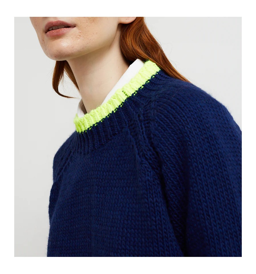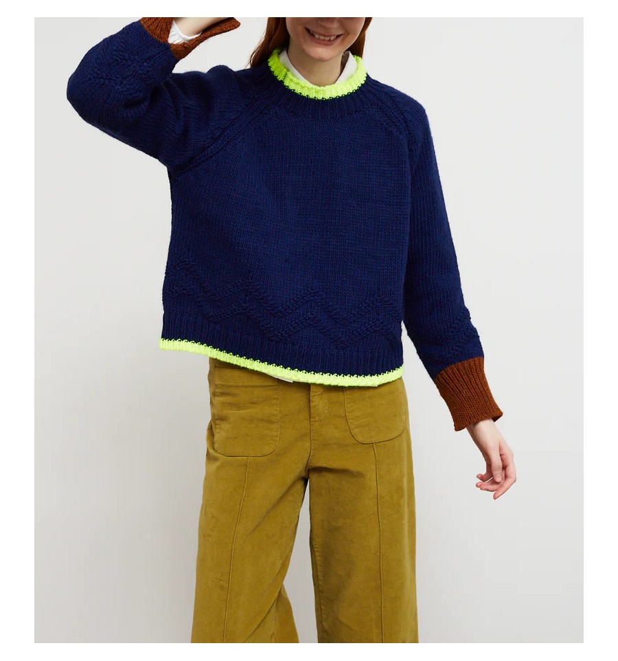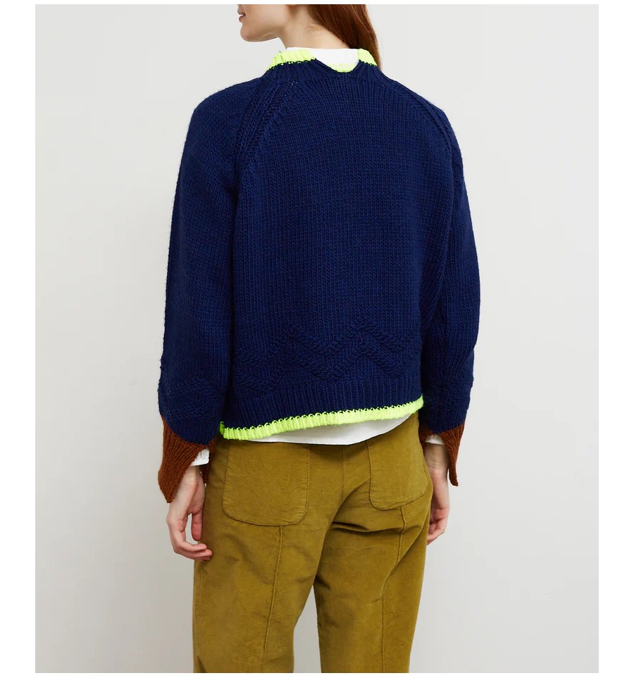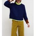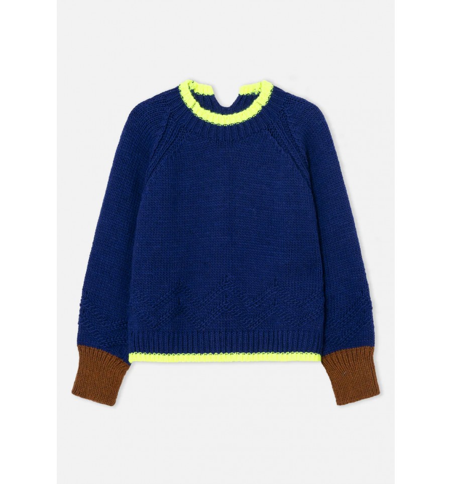 Jersey color azul, de corte recto con manga ranglán, confeccionado en punto grueso. Presenta detalle marrón en el cuello y en el bajo, que aportan un toque de contraste vibrante. Los puños están rematados en tono neón y una apertura lateral.