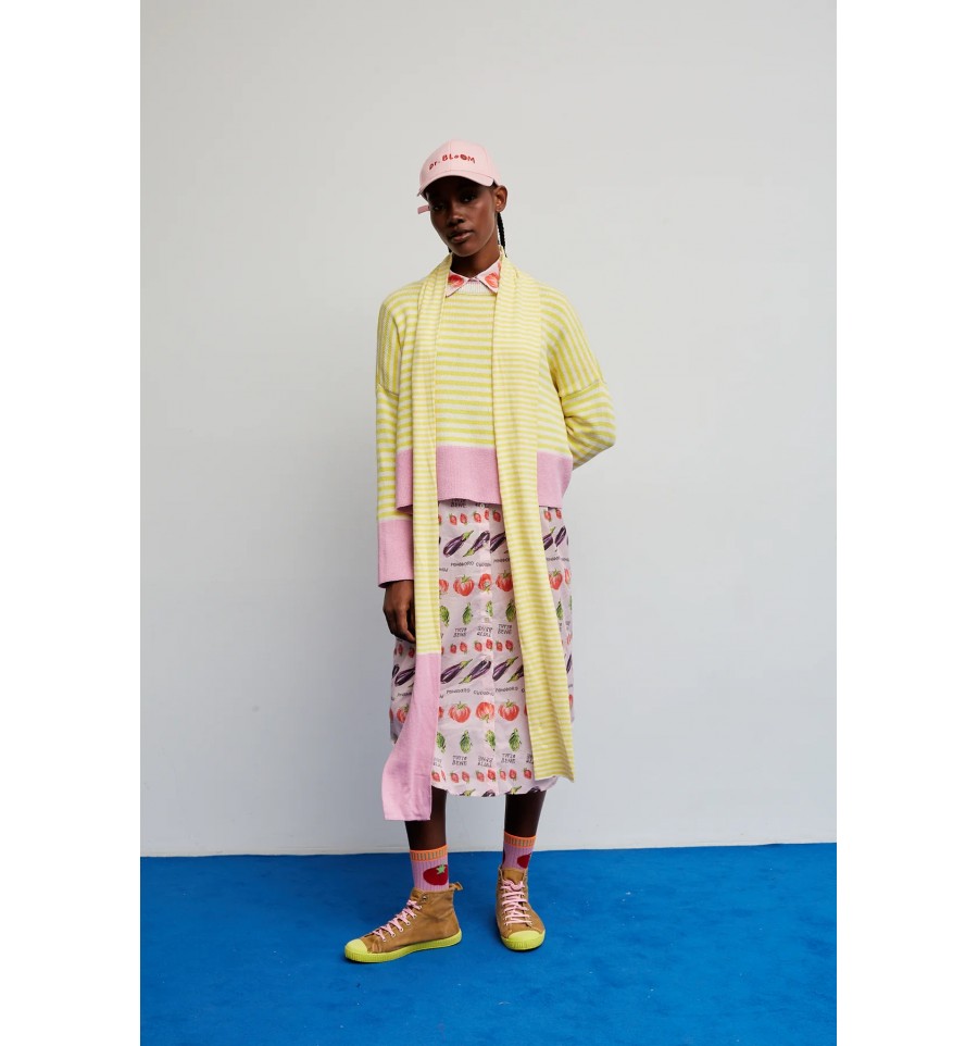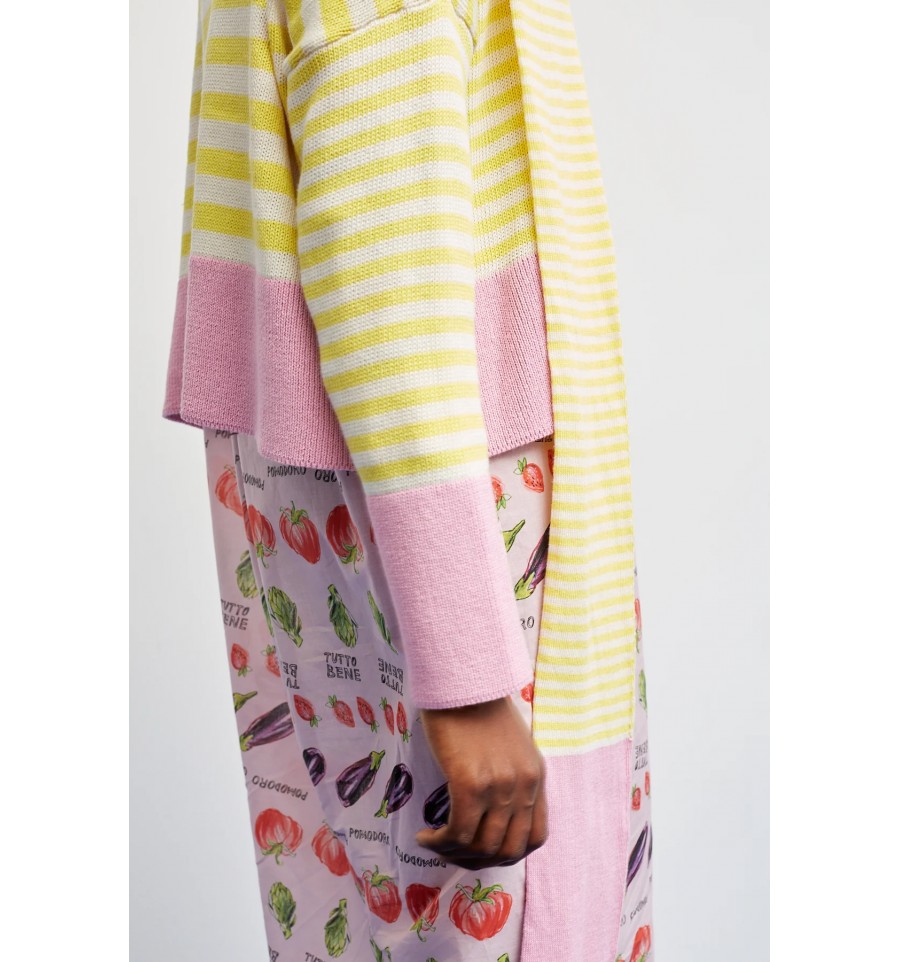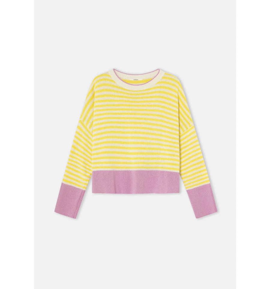 Un clásico renovado al estilo Bloom. Este jersey de rayas amarillas y blancas incorpora un toque moderno gracias a los detalles en color rosa presentes en el bajo, los puños y el ribete del cuello. El resultado es una combinación fresca, vibrante y muy favorecedora.