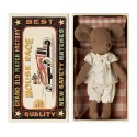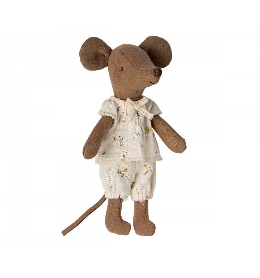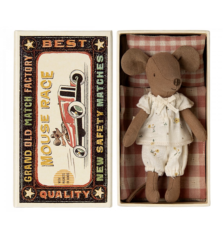 Un clásico de Maileg. Este ratón está listo para horas de juego y duerme en una cajita de cerillas. La ropa y la ropa de cama están hechas de suaves telas con estampados exclusivos de bellos colores. Amplía la historia añadiendo otros complementos.
