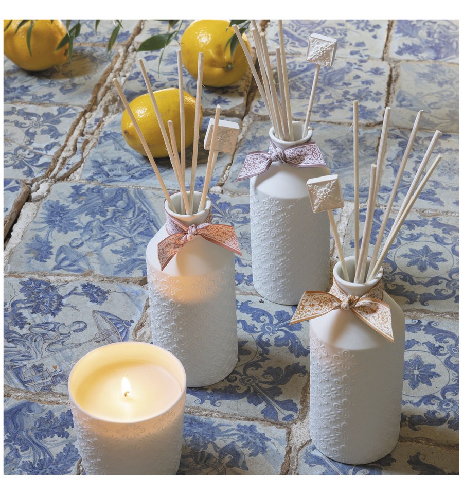 Descubra el difusor de fragancias para el hogar Escale à Sintra y sus elegantes decoraciones inspiradas en los azulejos portugueses. Perfuma continuamente el interior con Cotton Flower, un aroma suave y envolvente que nace del matrimonio de flores blancas, algodón y maderas preciosas.