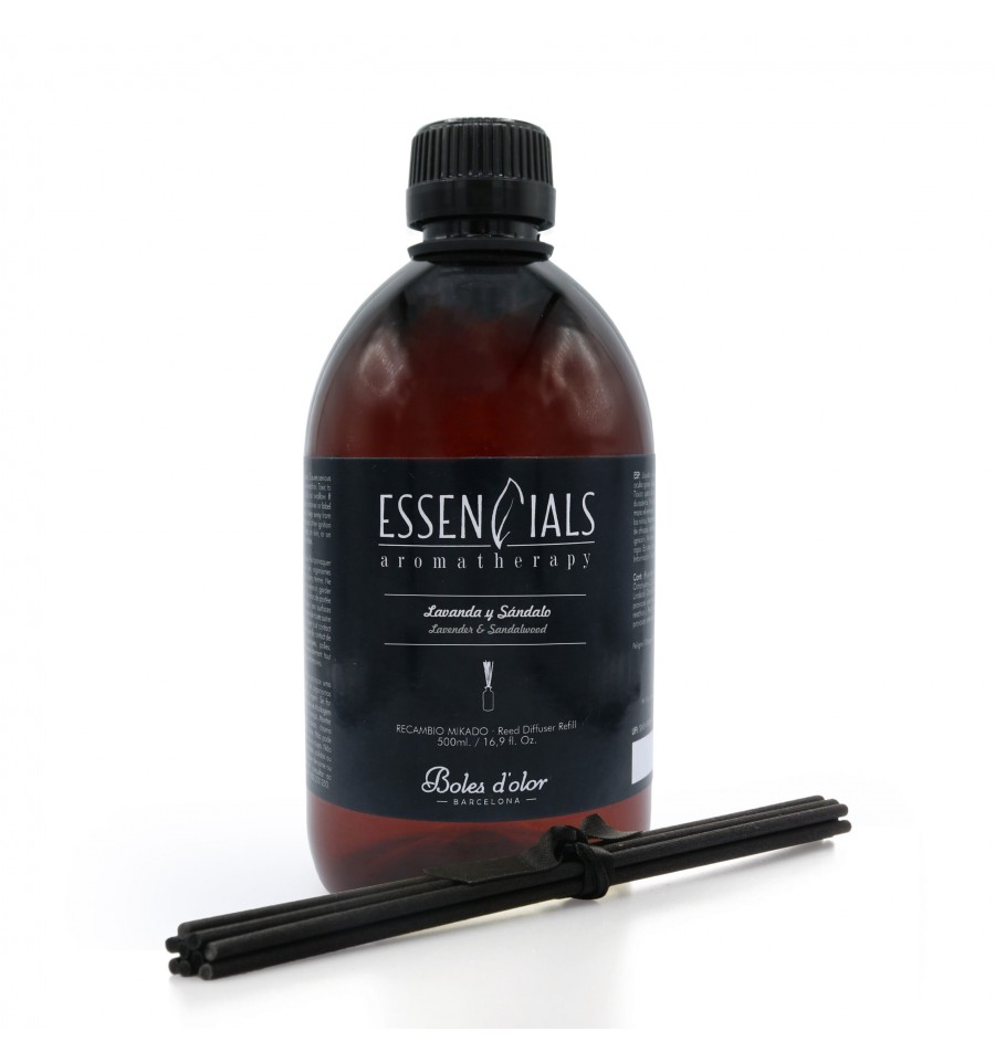 Con Aceites Esenciales de Lavanda y Sándalo. Crea una atmósfera de Paz y Tanquilidad. La Lavanda promueve la relajación. El Sándalo aporta magia y elegancia.
