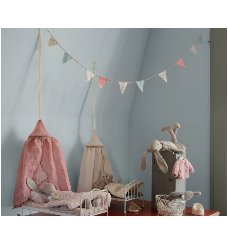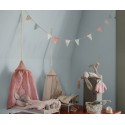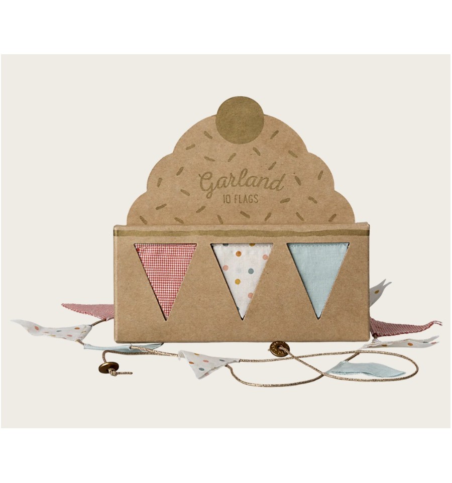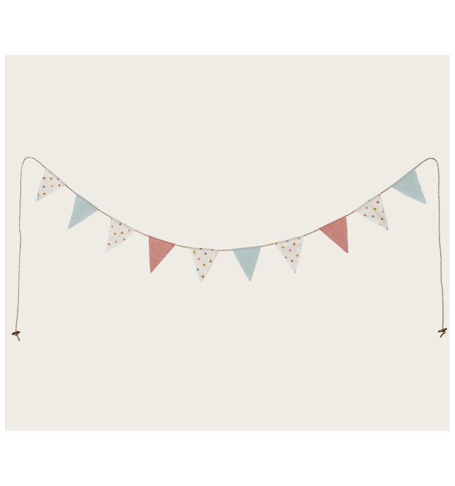 Una nueva guirnalda con banderas hecha con tela Maileg. Perfecta para cualquier rincón de la habitación infantil. Contiene 10 banderas y 2 monedas con el logo en los extremos. Mide 115 cm de largo.