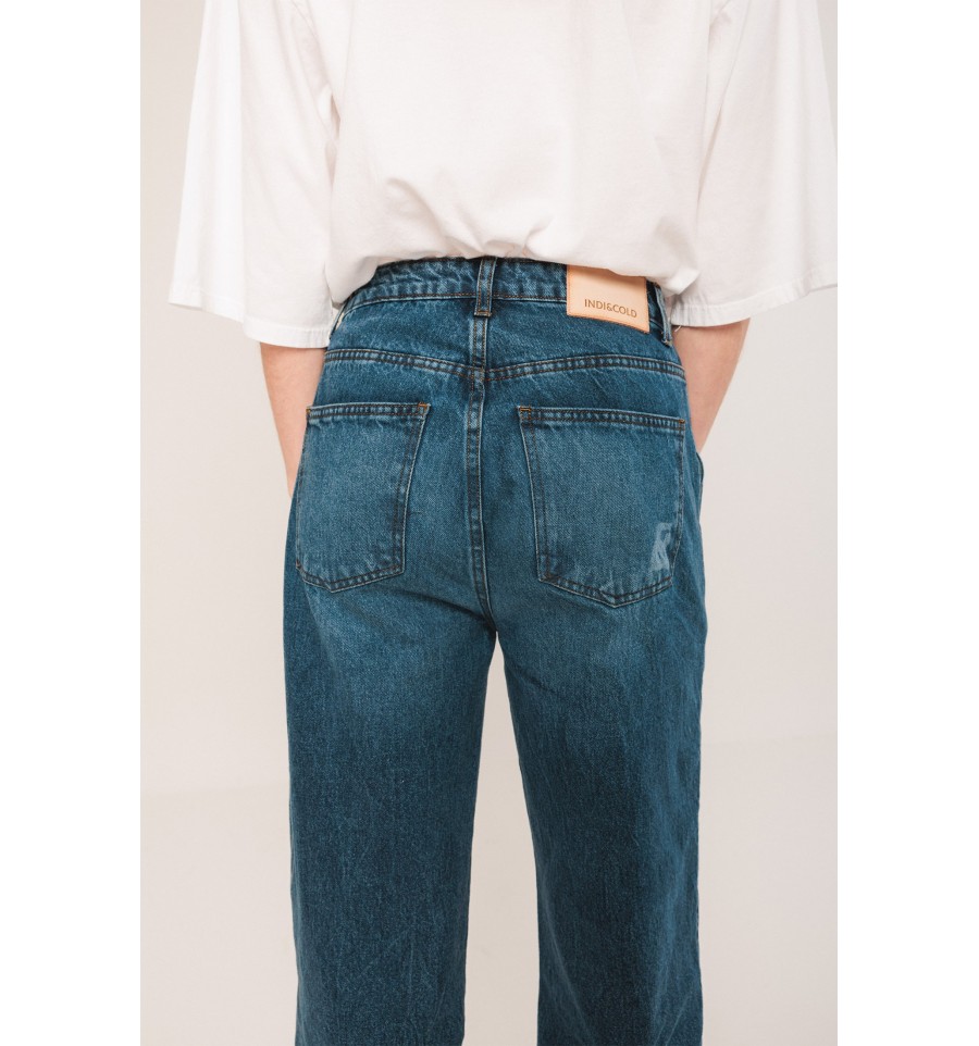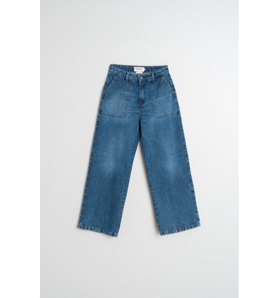 Pantalón denim lavado Made in Spain. Cintura media, bolsillos de corte francés y pernera recta con fit regular.