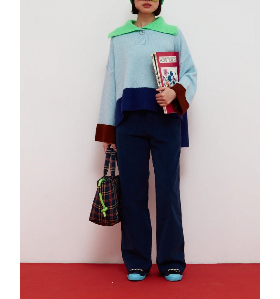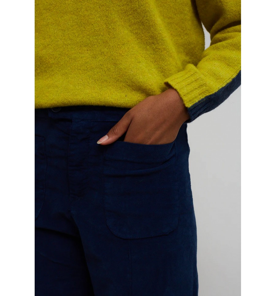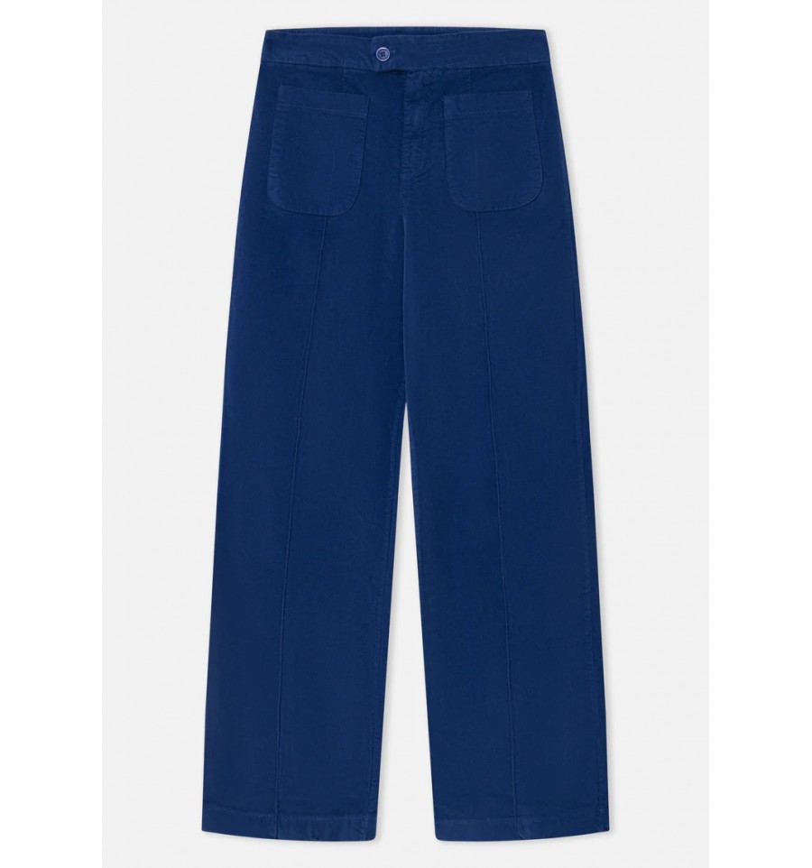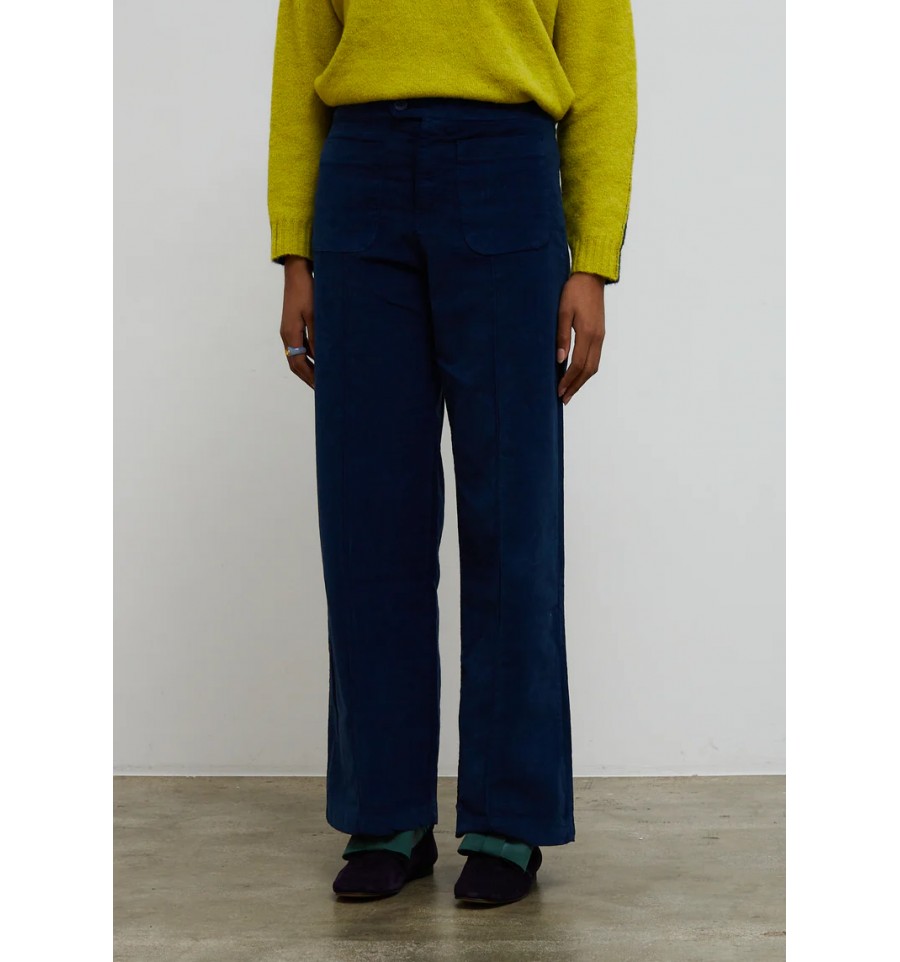 Pantalón de terciopelo color azul. Corte recto y tiro regular. Bolsillos frontales y posteriores cuadrados. Cremallera y botón al tono para un ajuste perfecto. Costuras marcadas verticales en ambas piernas.