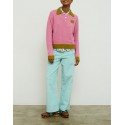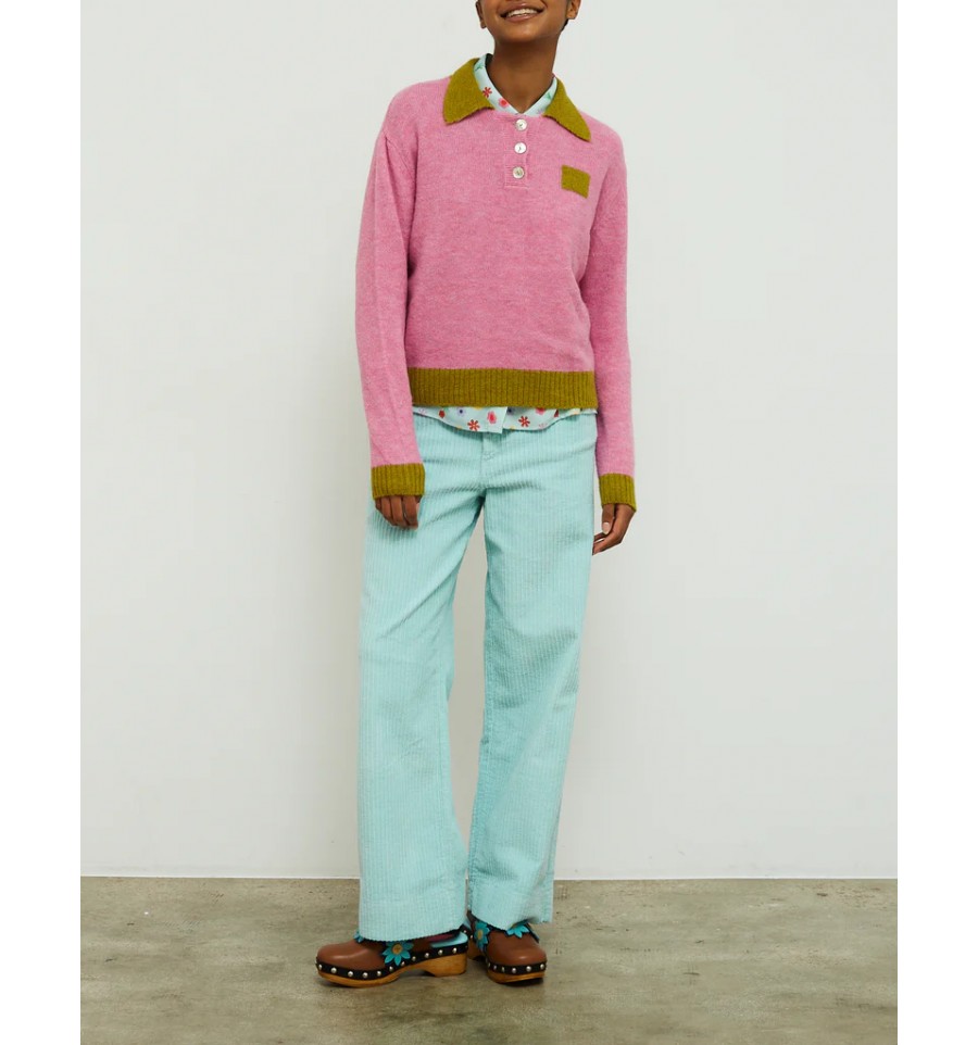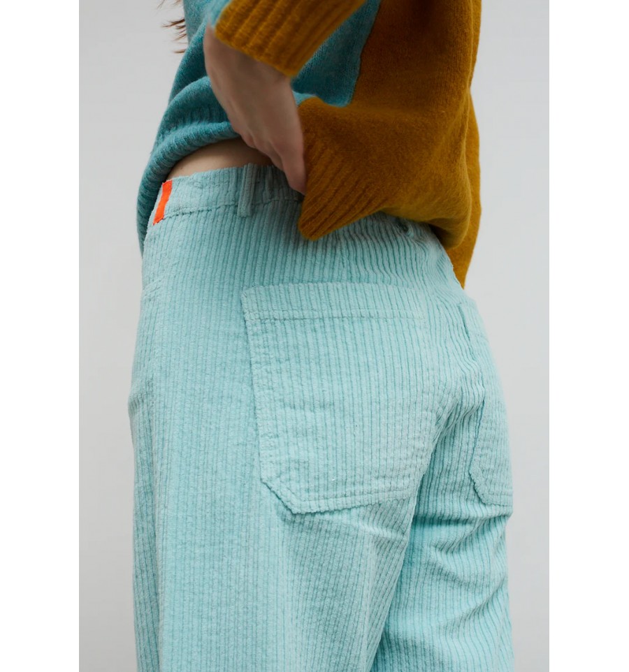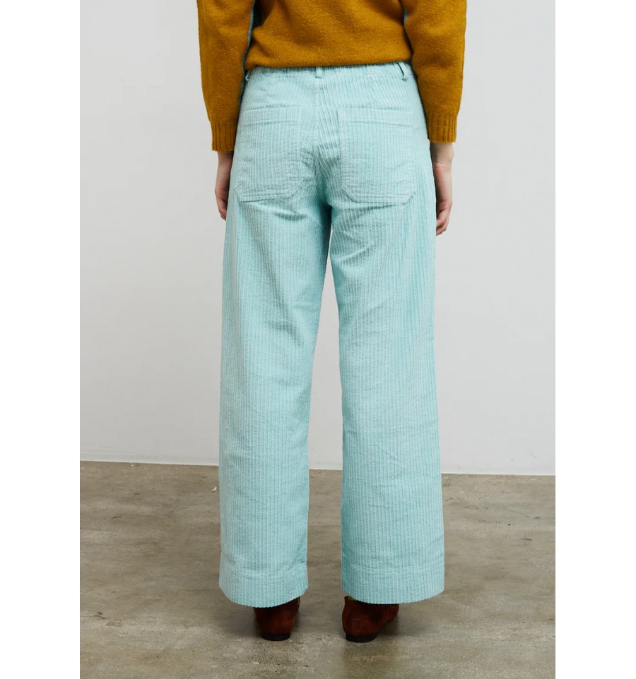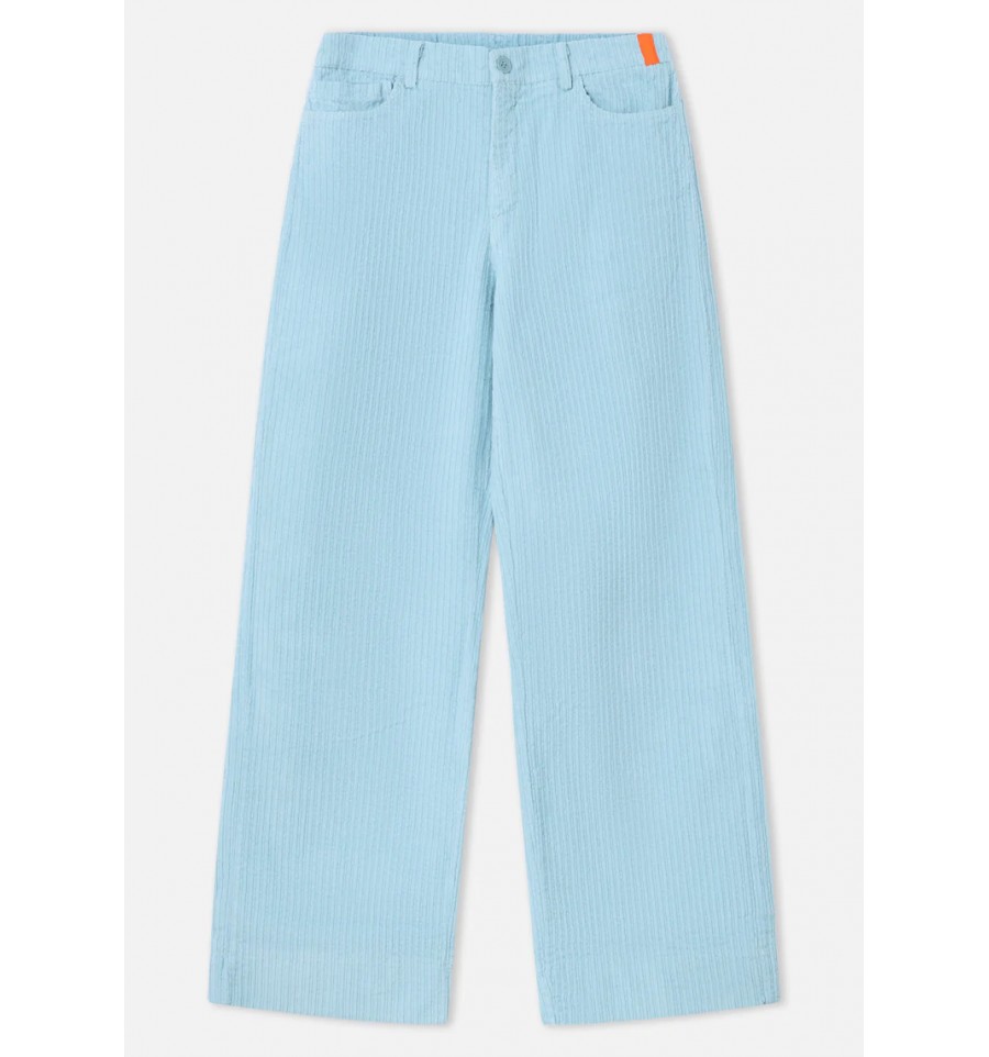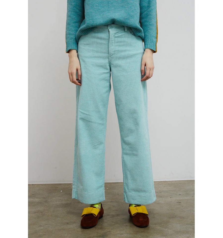 Pantalón largo, color agua, de pana ancha. Corte recto y ancho, confeccionado en un tejido de pana gruesa, con un punto elástico, para más comodidad. Cierre frontal mediante cremallera oculta y botón visible.