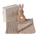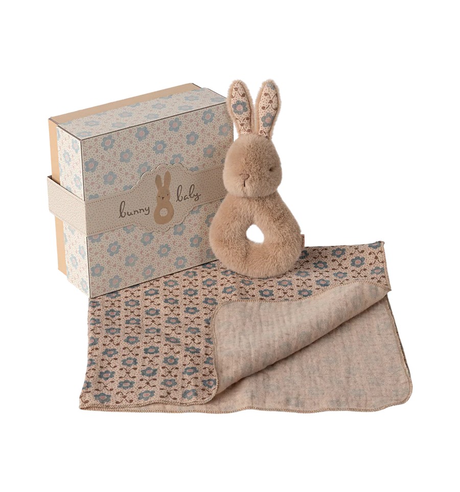 Una idea de regalo perfecta para los más pequeños. El set incluye un paño de algodón suave y un pequeño sonajero de conejito. El conejito tiene un pequeño sonajero en el interior que hace un sonido suave. Todo viene en una hermosa caja de regalo.