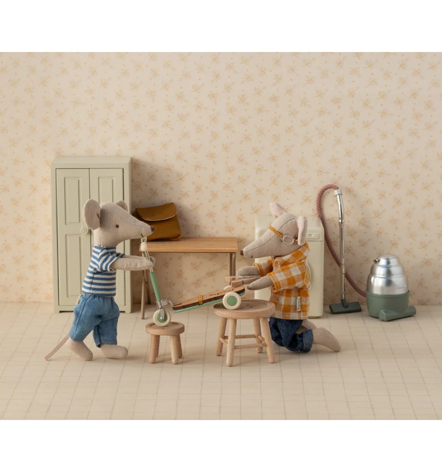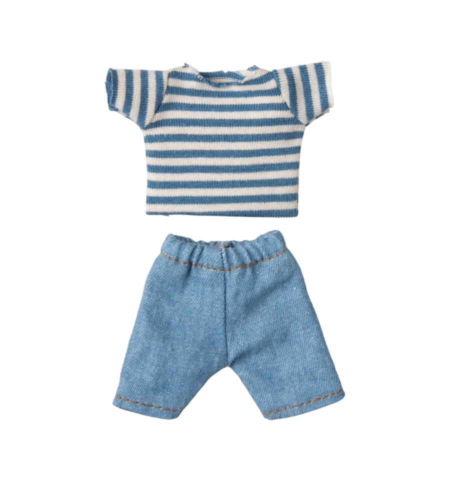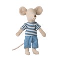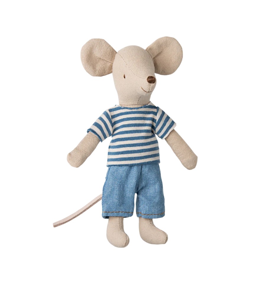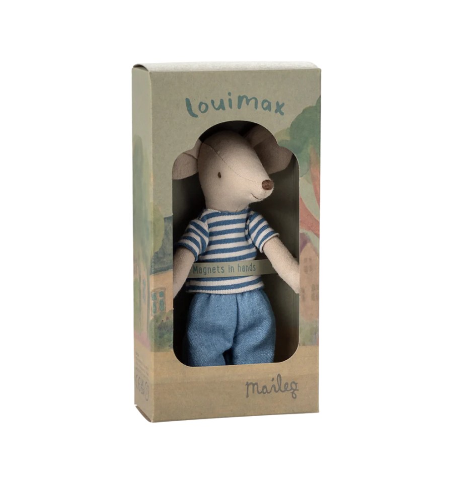 Este ratón se llama LouiMax y es un tipo muy aventurero. Lleva una camisa a rayas azules y unos pantalones vaqueros. El ratón tiene imanes en las manos y viene en una caja de decoración. El ratón es tamaño hermano mayor.