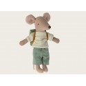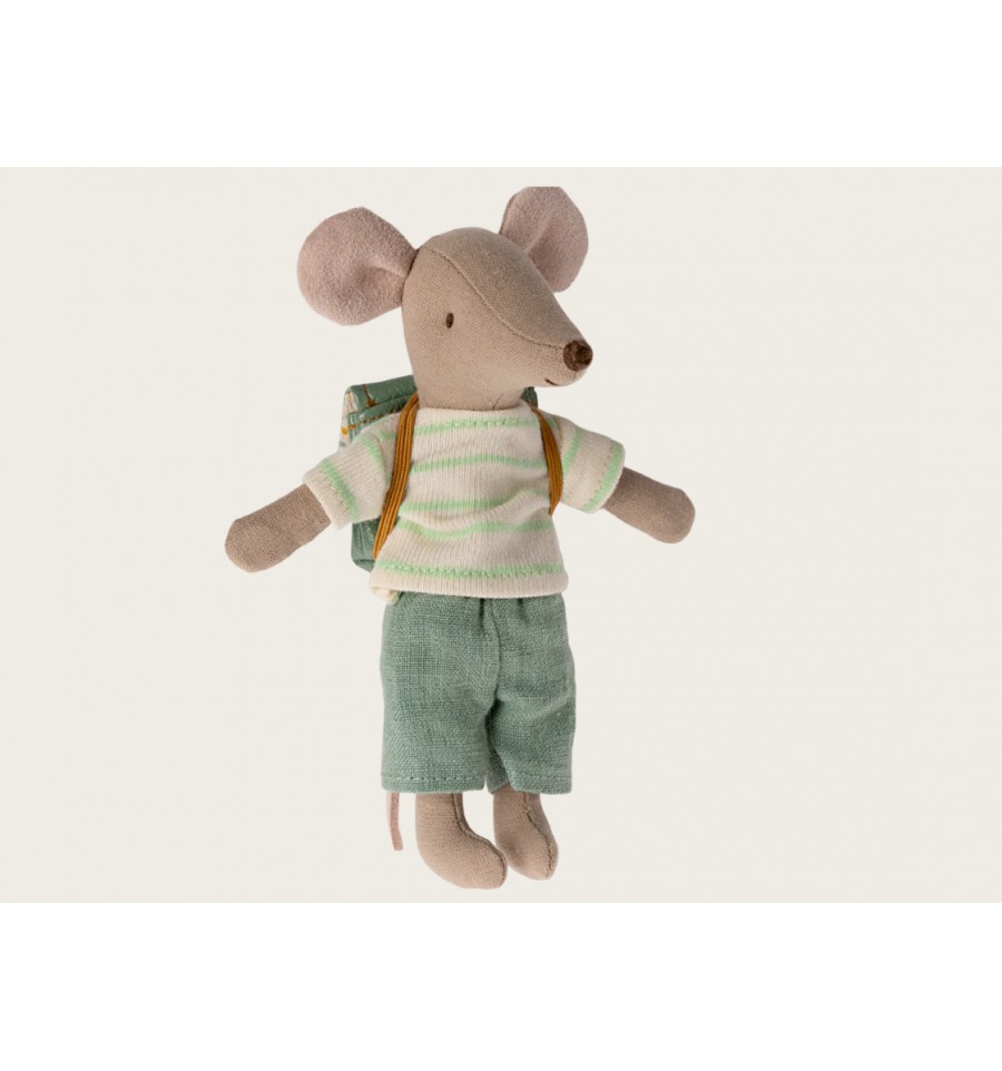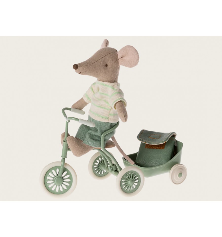 El ratón hermano mayor va vestido para un día de escuela y lleva su mochila en la espalda. Tiene imanes en las manos para sujetarse de las manijas del triciclo a la hora de ir a alta velocidad.