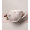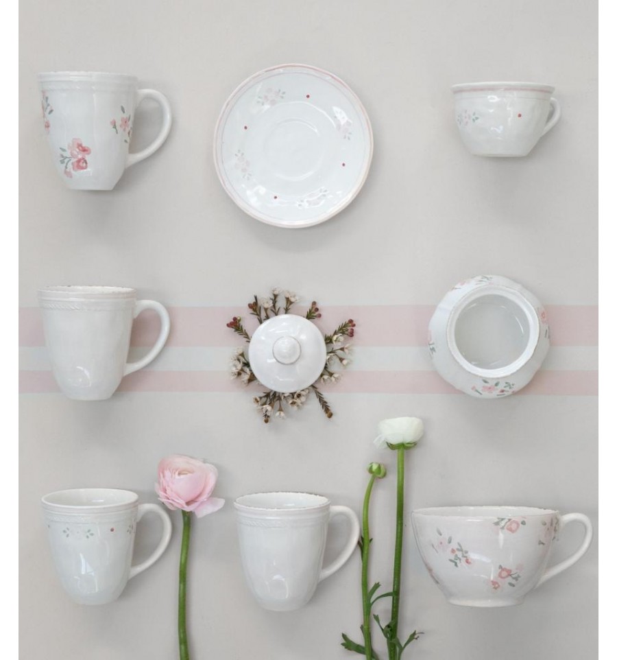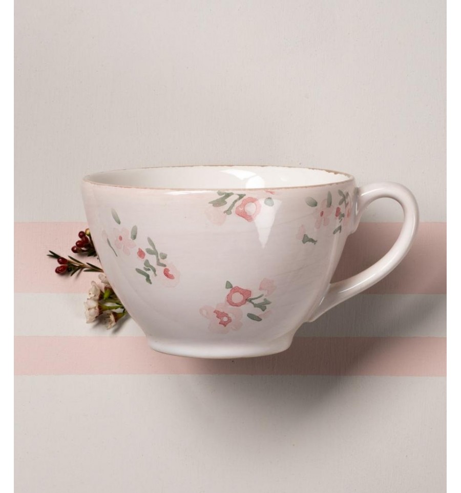 Taza de cerámica, decorada a mano, con flores rosas.