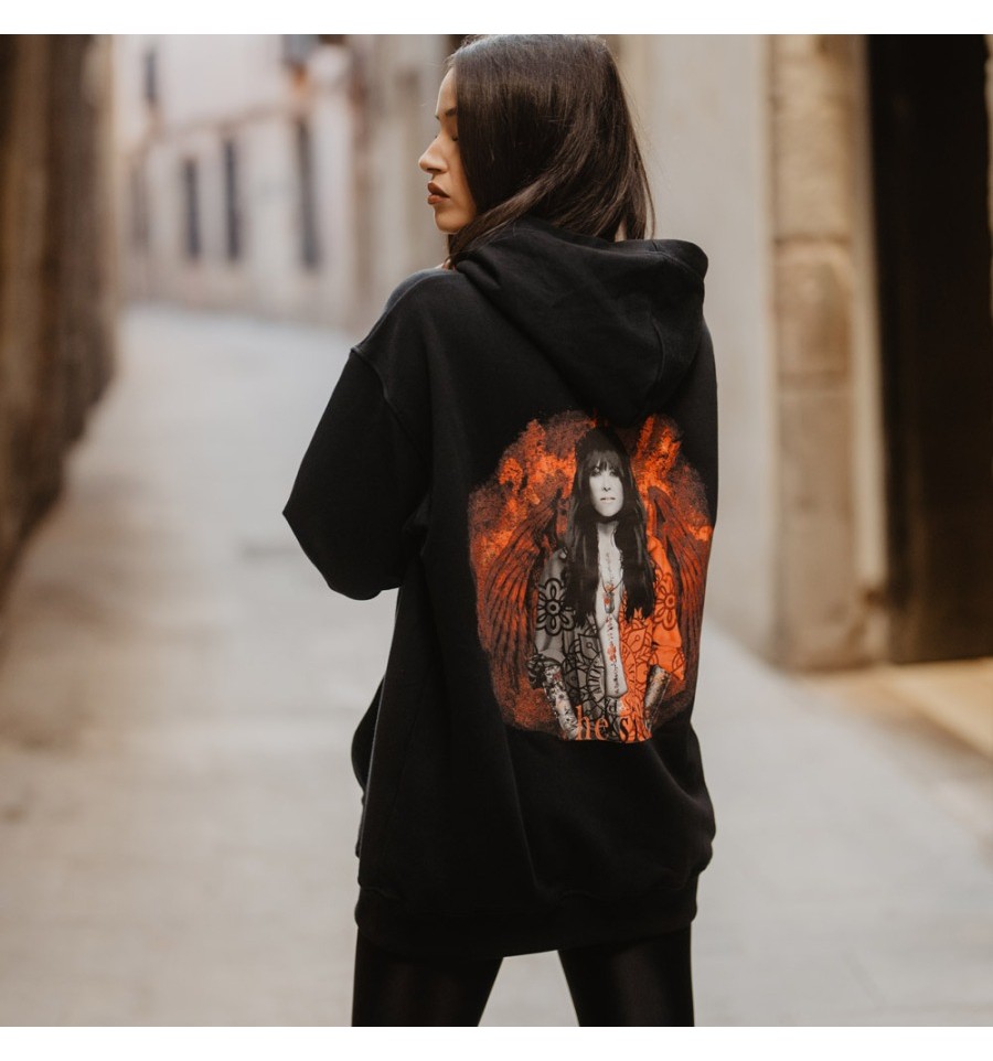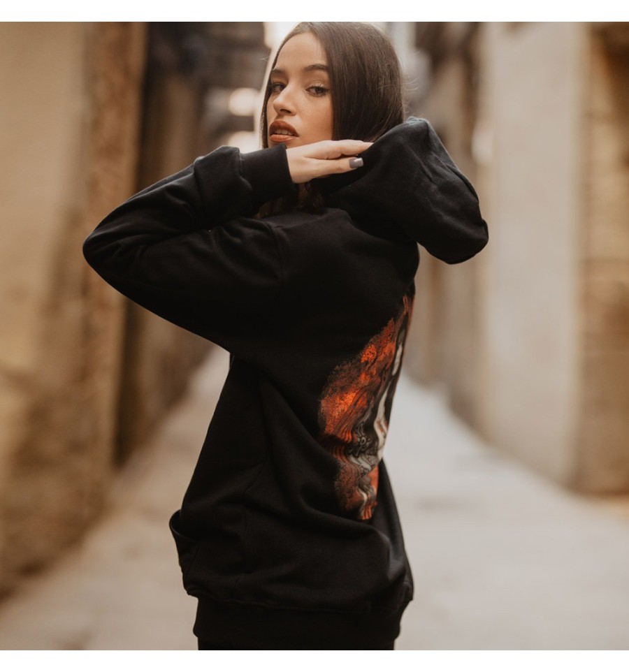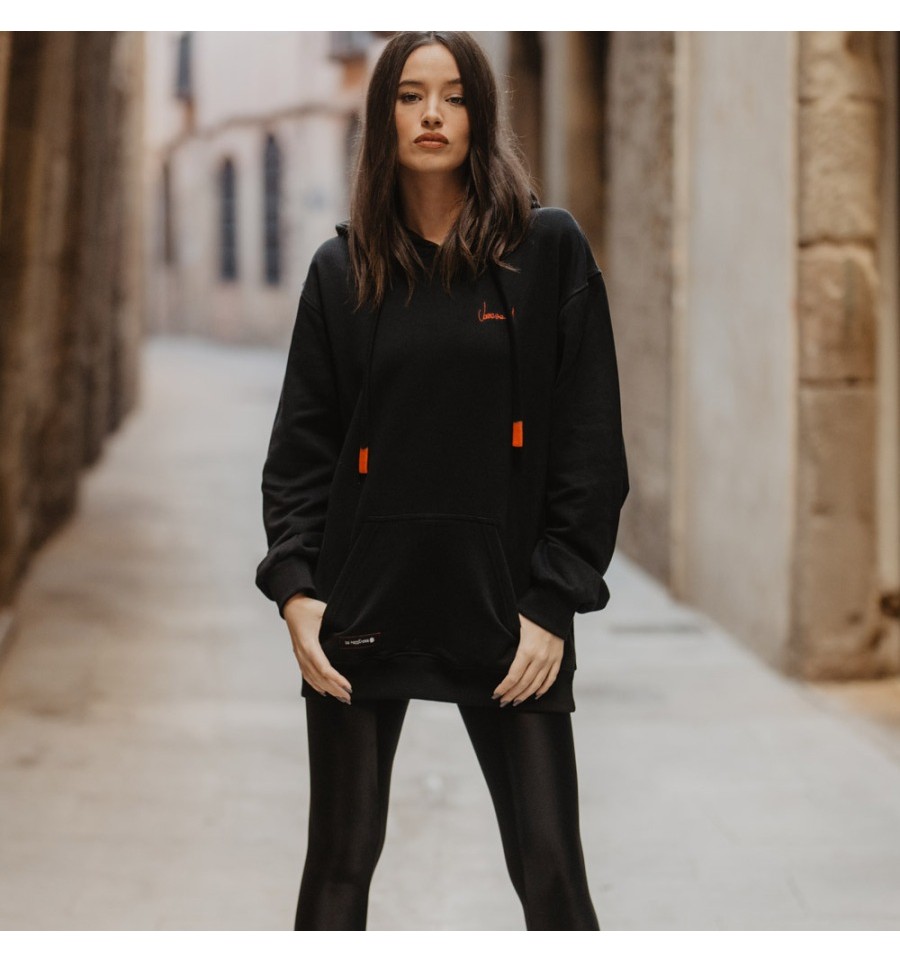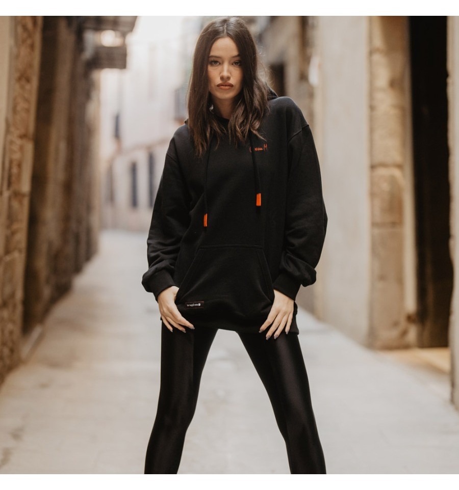 Negra *Bolsillo tipo canguro, cordón ajustable en el mismo color que la sudadera, remate del cordón engomado en naranja