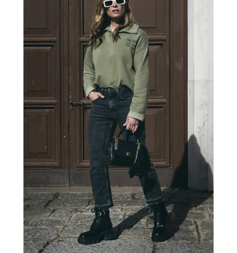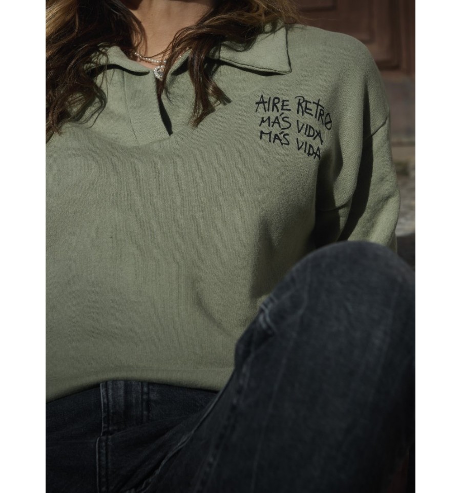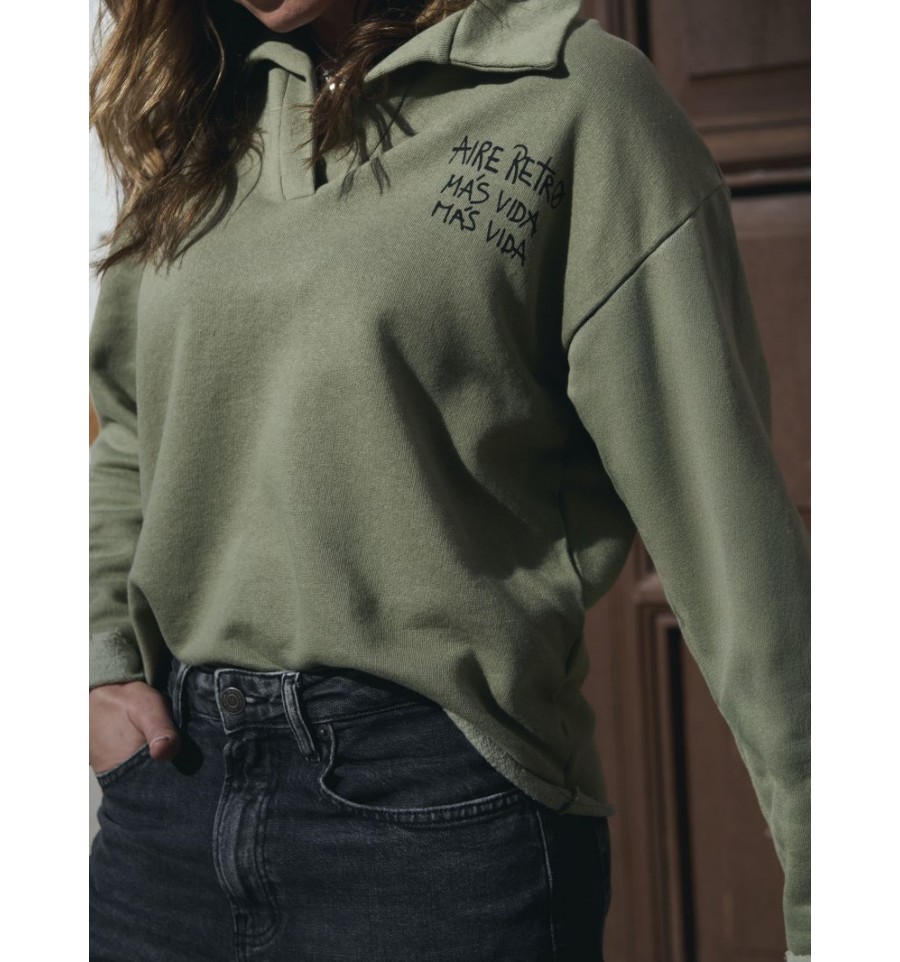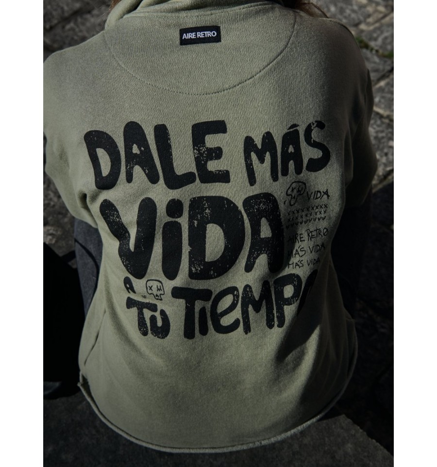 Sudadera tipo polo de algodón gris con cuellos, tiene ilustración delantera y trasera de Dale más vida a tu tiempo.