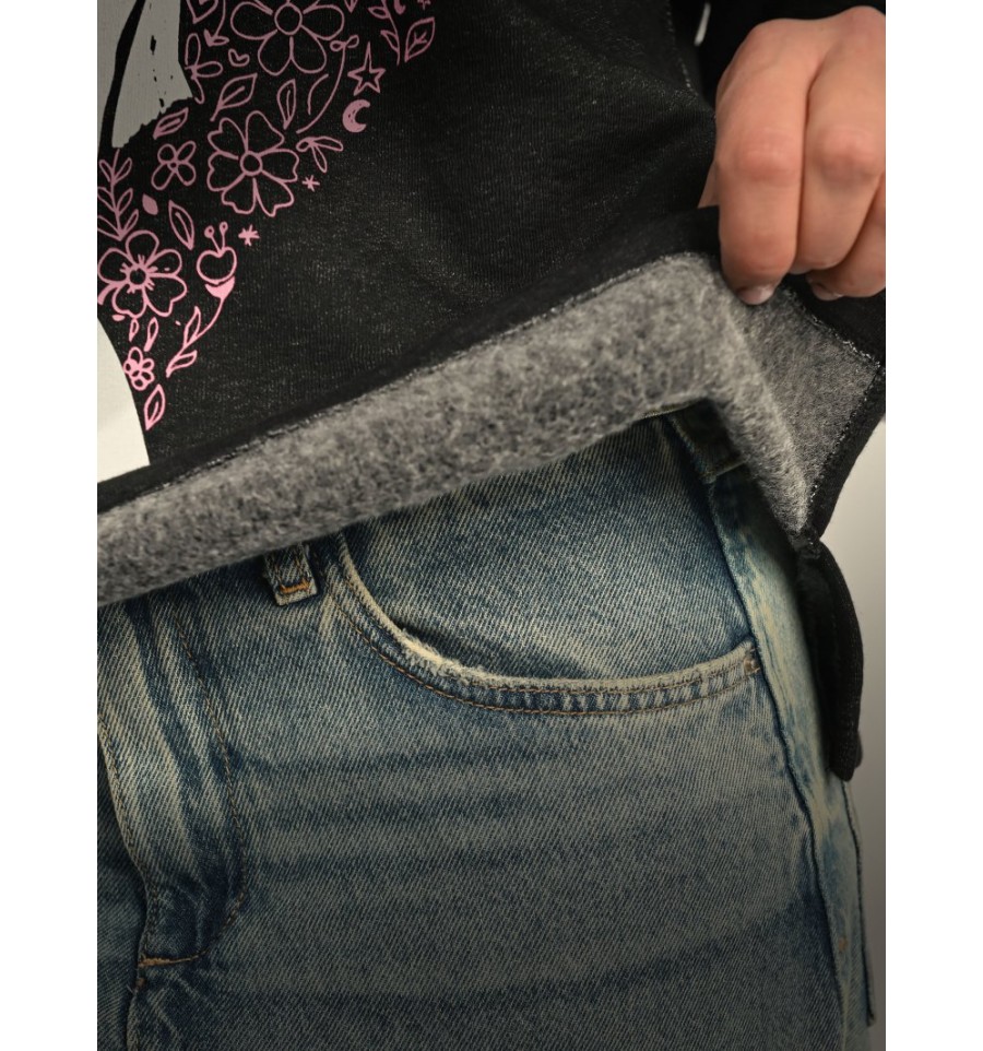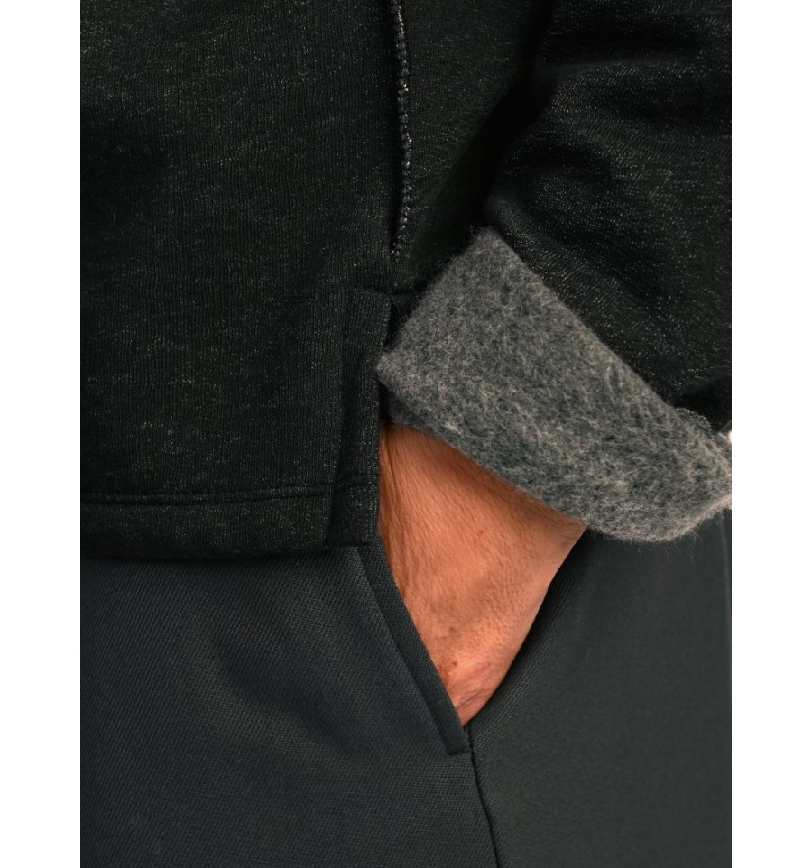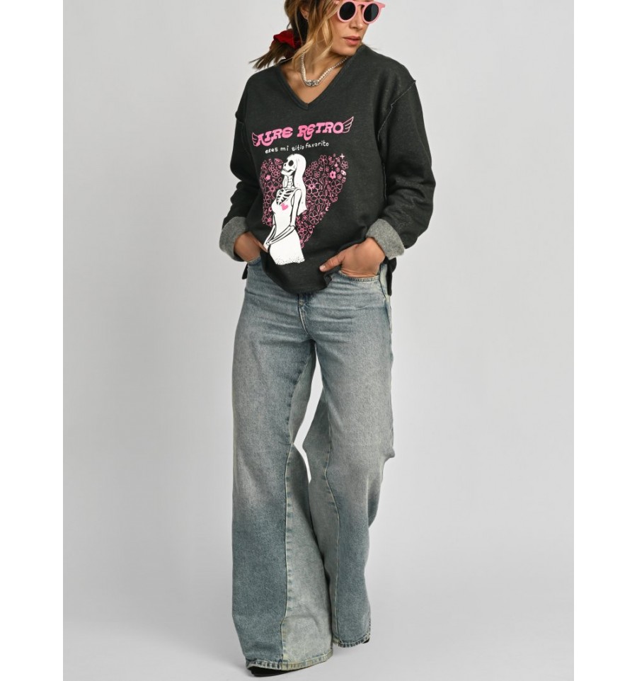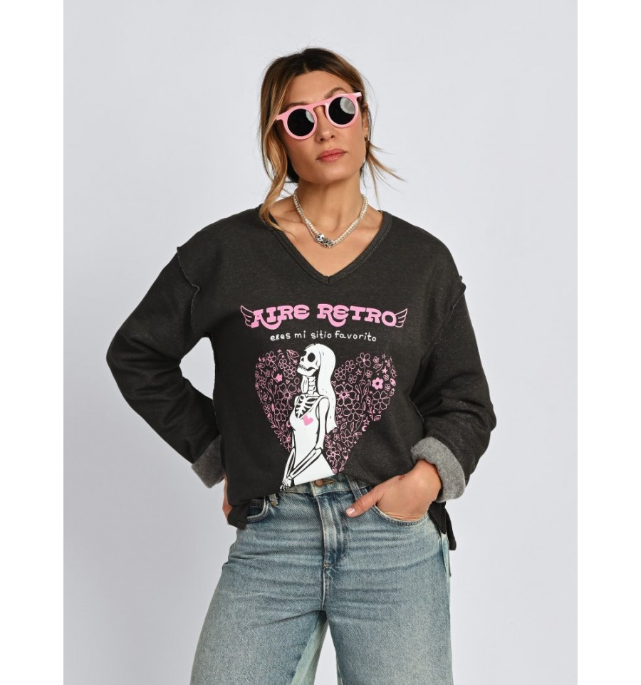 Sudadera gris de corte muy elegante con cuello pico y felpa interior. Diseño con serigrafía tipo grabado en dos colores.