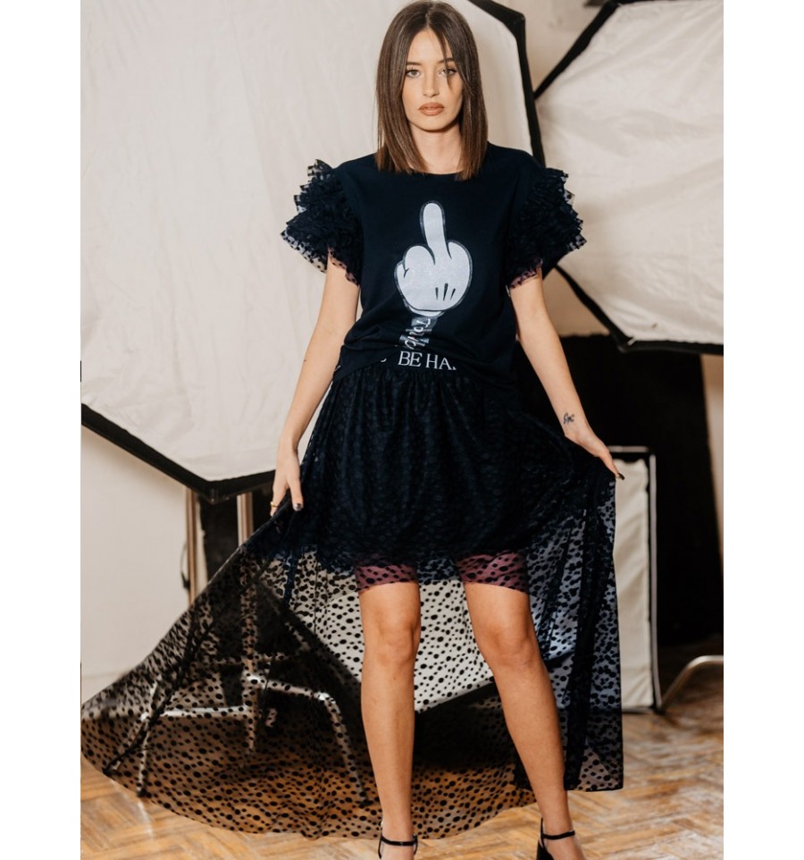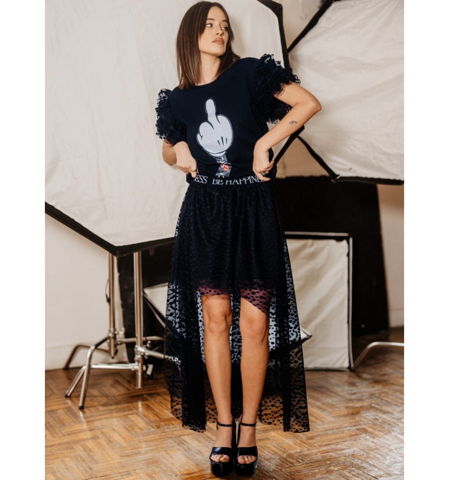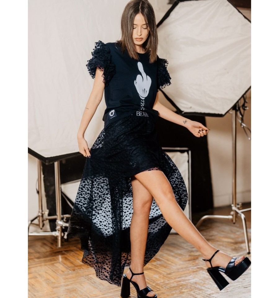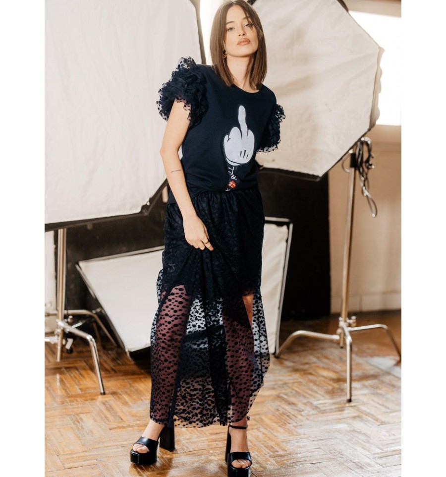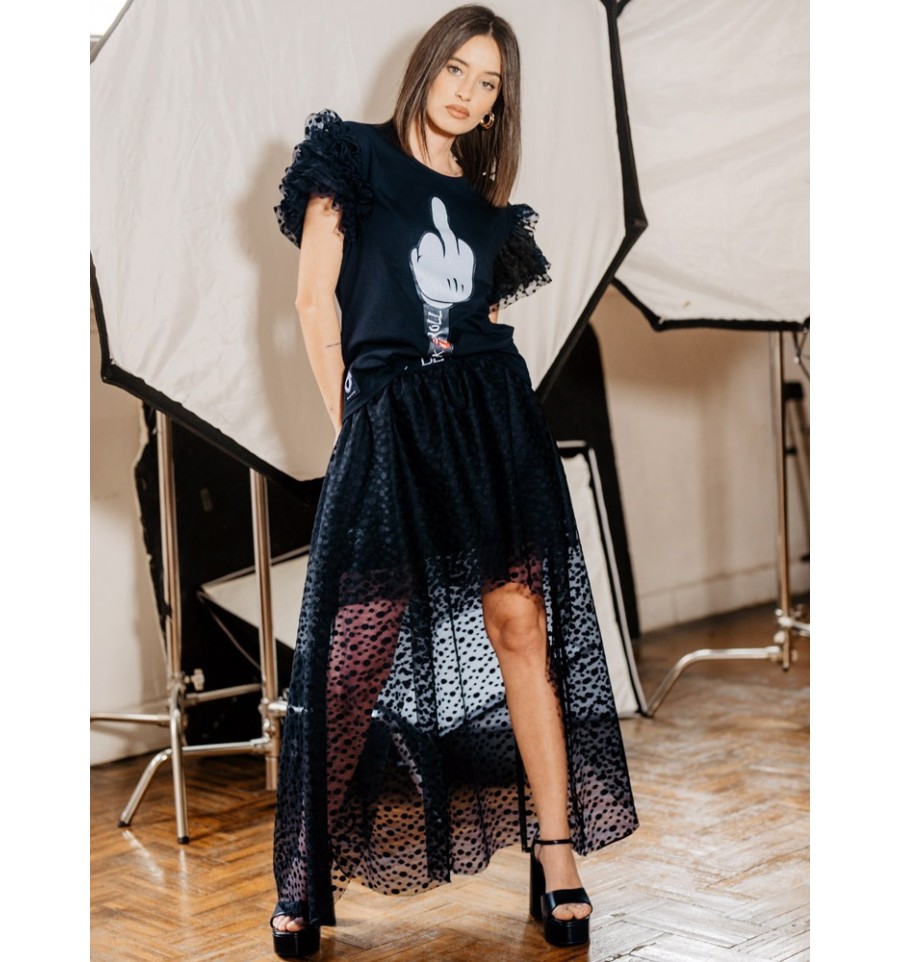 Falda tul con topos en color negro bordado, con capas ligeras, forro corto de punto elástico para mayor comodidad.