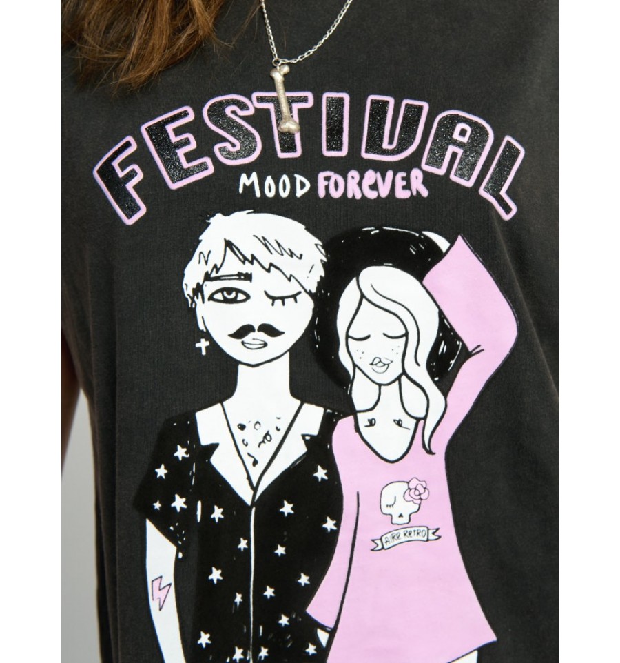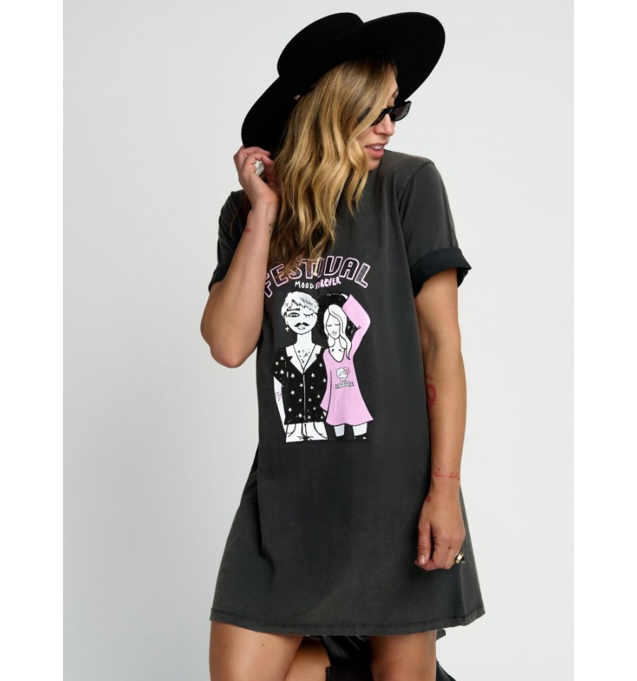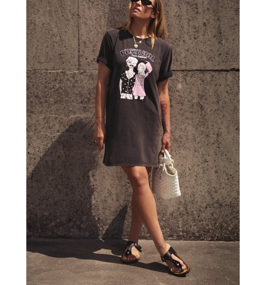 Vestido tipo camiseta 100% algodón de primera calidad con lavado fade out, ilustración "FESTIVAL" con las letras efecto caviar y glitter, porque como ya sabéis no hay nadie que le guste más un festival que a mi jijijij