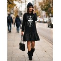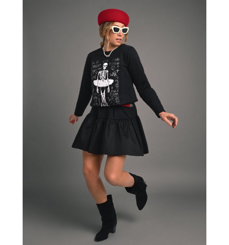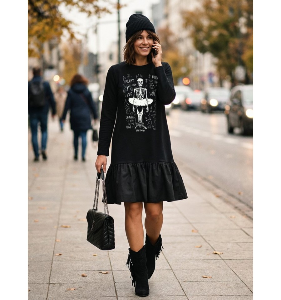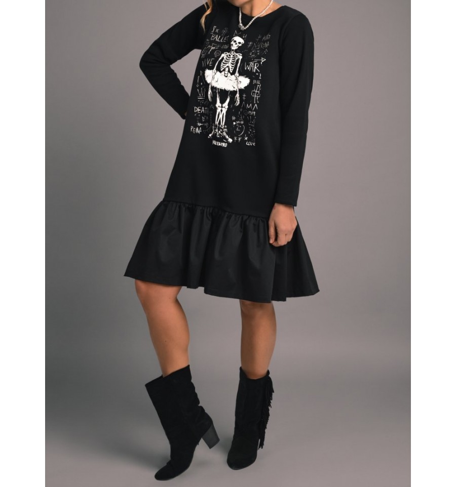 Vestido oversize tipo camiseta con volante y volumen abajo. Estampado "Ballet" en blanco y efecto relieve, con letras de al rededor efecto plata. Un vestido chic con nuestro toque rock!