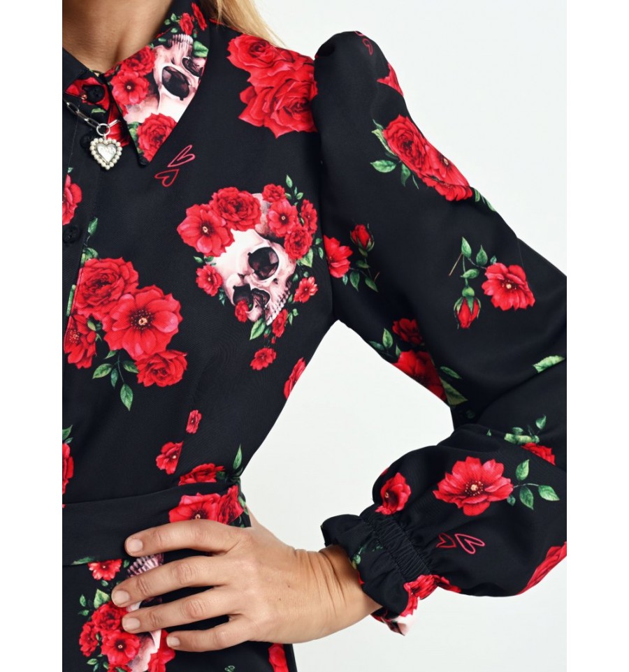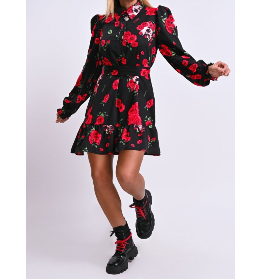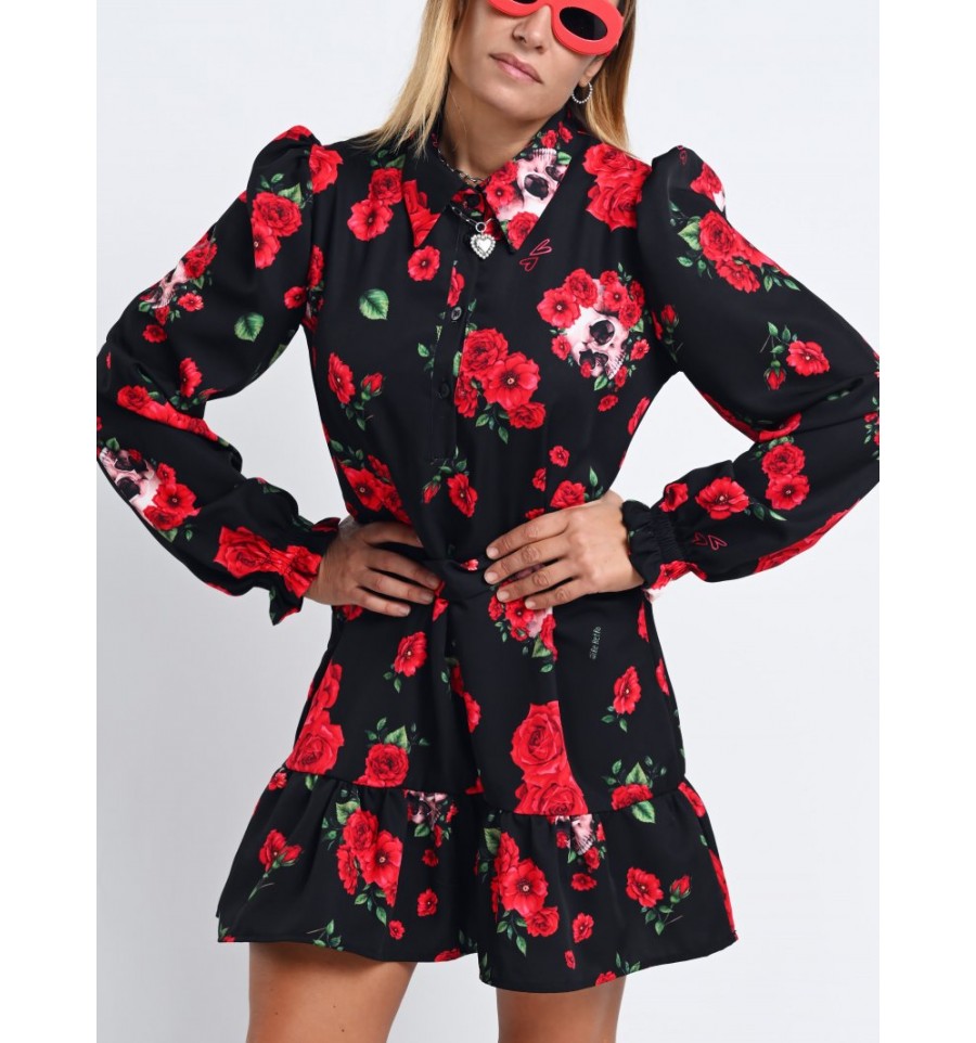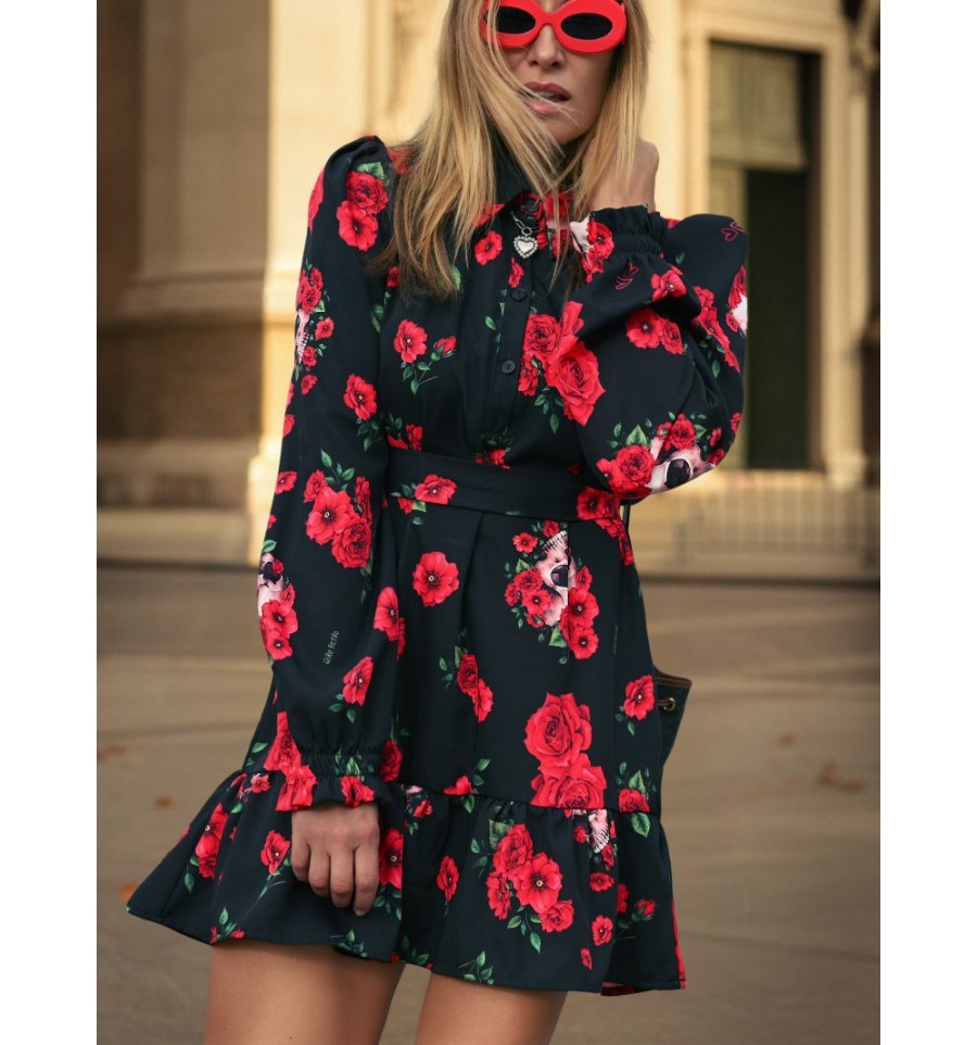 Vestido corto de manga larga con cuello camisero, falda con volantito y tira de botones en la parte delantera. Trae un lazo a juego para que escojas en donde te gusta más, como lazada al cuello, en el pelo o cinturón!